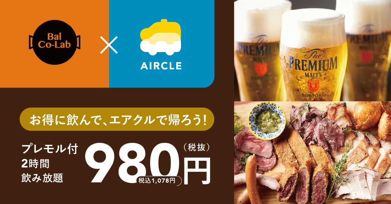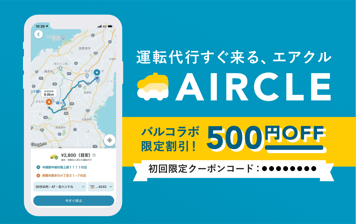 運転代行配車アプリ「AIRCLE(エアクル)」を展開する株式会社Alpaca.Lab(所在地:沖縄県中城村、代表取締役:棚原生磨、以下当社)は、沖縄県内にて会員限定特別キャンペーン!を実施します。エアクル会員の皆様は、キャンペーン期間中に琉球アスティーダスポーツクラブ株式会社(所在地:沖縄県中城村、代表取締役:早川 周作)が運営するバルコラボの対象店舗にて、通常2時間飲み放題1,628円(税込)のところを1,078円(税込)にてお楽しみ頂けます。さらに、バルコラボ内に設置されたポスターよりエアクルを新しくダウンロードされたお客様には、エアクルで使える500円クーポンを追加でプレゼント致します。