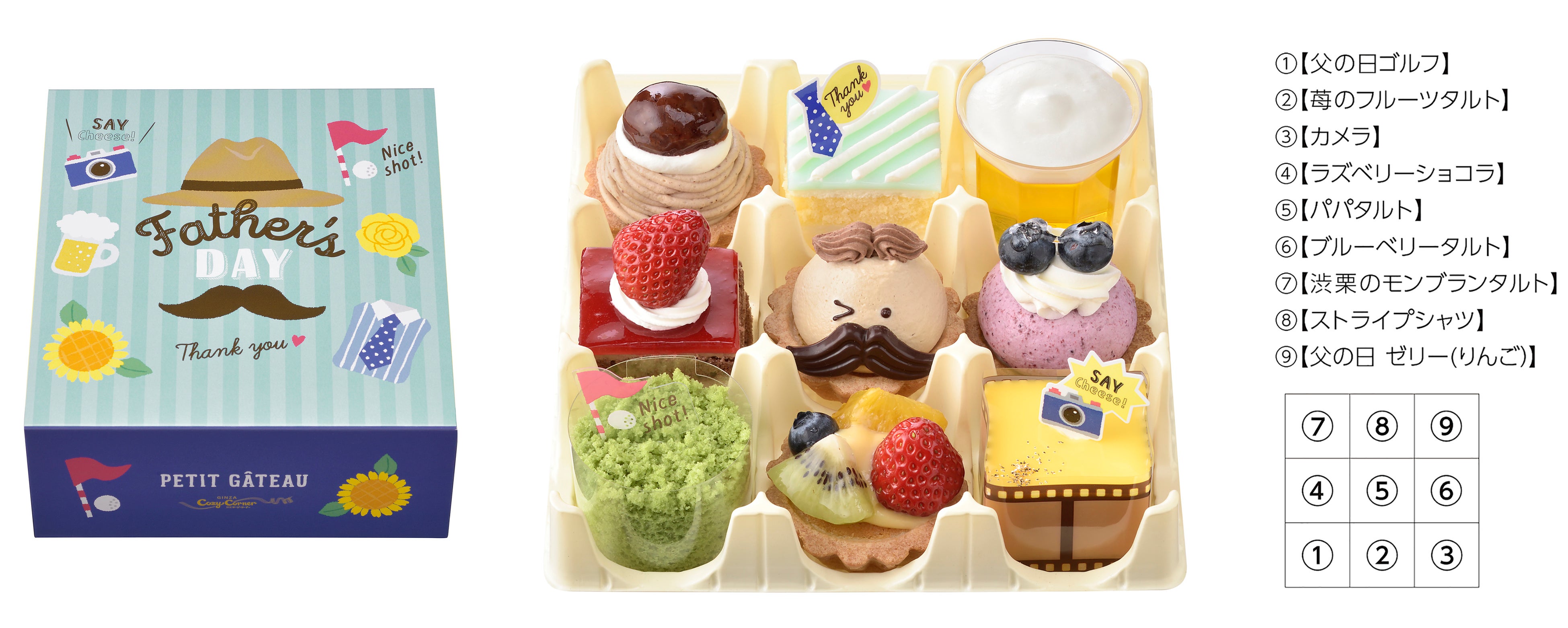 主役のお父さんをモチーフにした「パパタルト」を中心に、“ゴルフ”や“カメラ”などお父さんが好きなものをイメージしたケーキなどをアソート。家族みんなでお楽しみいただけます。