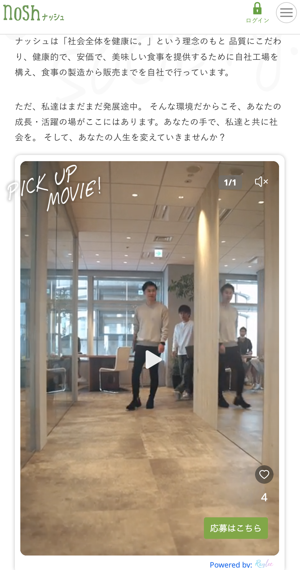 x-climb株式会社(本社:東京都中央区銀座、代表取締役CEO 飯降敦史)は、国内初の企業向け縦型動画サービス Raylee -レイリーを、手軽に美味しく栄養管理ができる冷凍宅配食サービス「nosh」を手掛けるナッシュ株式会社(本社・大阪市、代表取締役 田中智也)に提供し、”縦型採用動画”を公開致します。