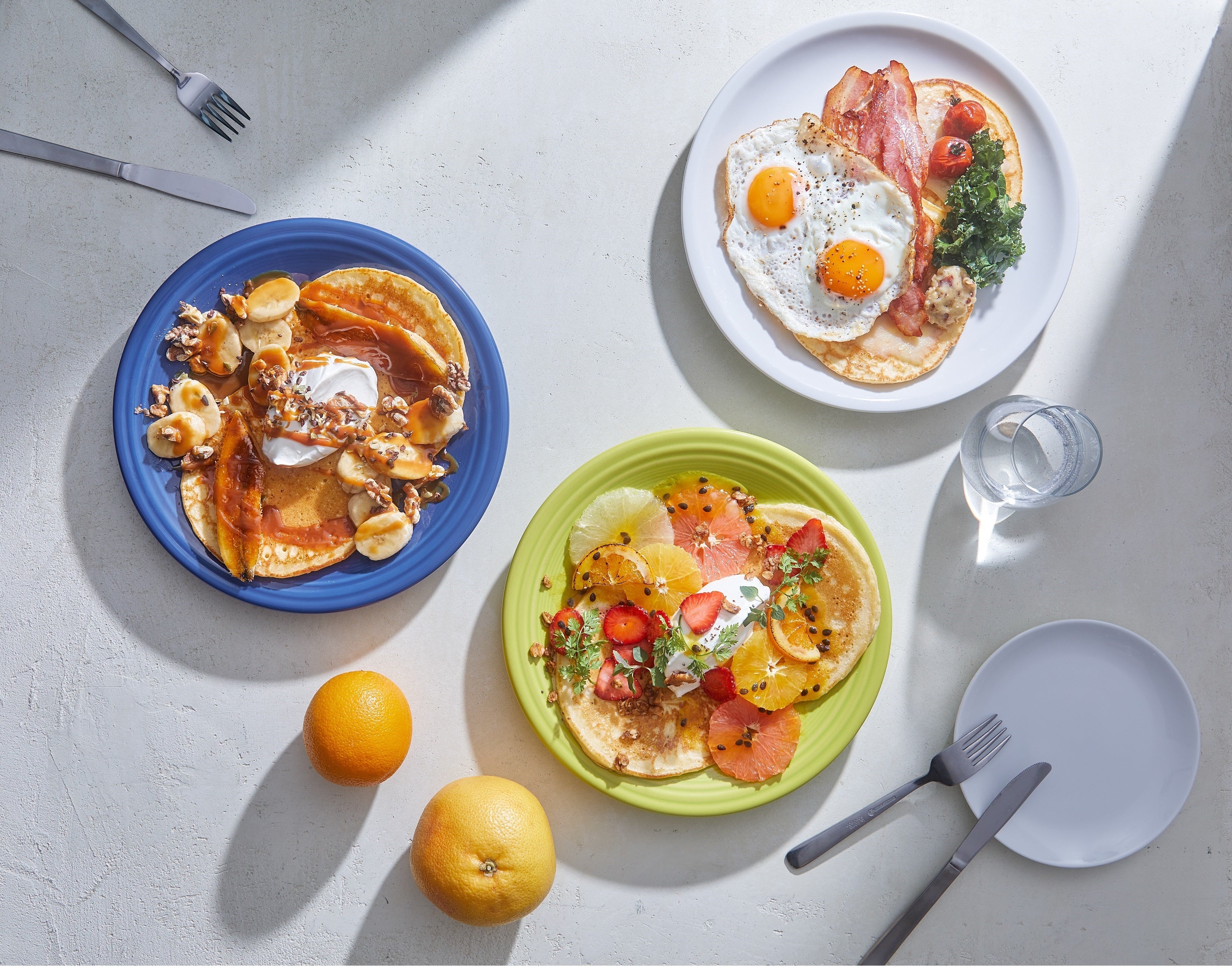 米粉とオートミールを使ったグルテンフリーのパンケーキは、さくふわっとした軽やかな生地に、ホイップやフレッシュなフルーツをたっぷりと合わせました。