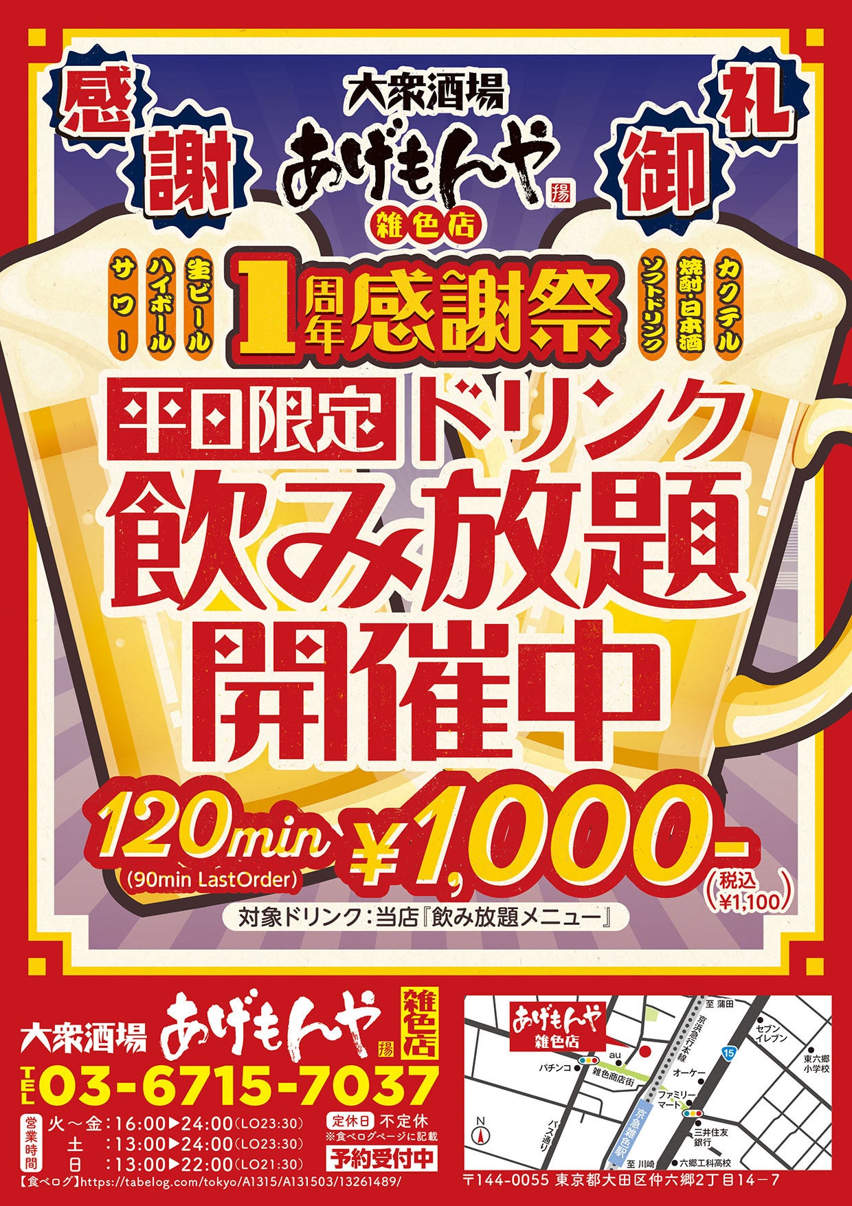 [イベント名]雑色店1周年感謝祭 “ドリンク飲み放題”特別価格
