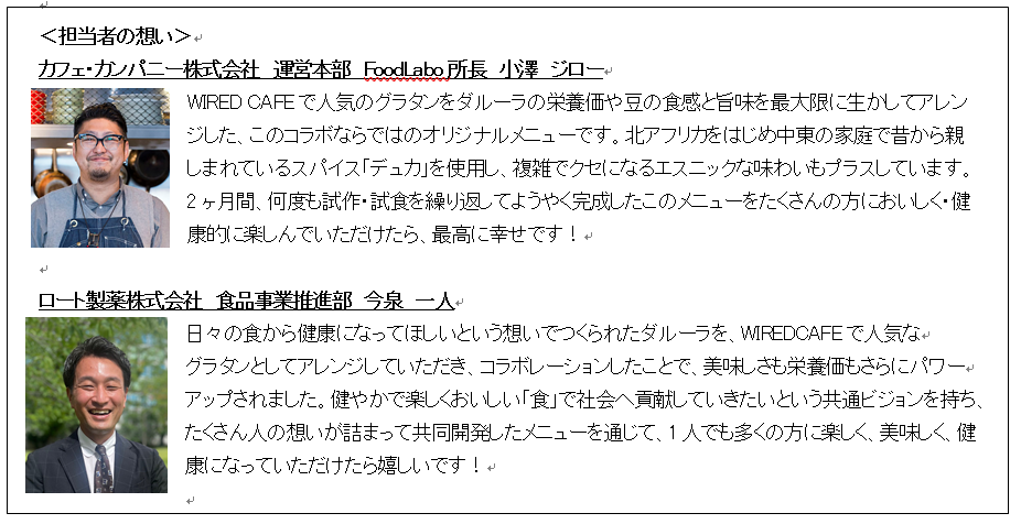 ロート製薬株式会社(本社:大阪府大阪市、社長:杉本雅史、以下当社)とカフェ・カンパニー株式会社(本社:東京都渋谷区、社長:楠本修二郎、以下カフェ・カンパニー)は、当社の商品であるオーガニック豆の具だくさんスープ「ダルーラ」を活用したオリジナルメニュー「2種のお豆とかぼちゃのオートミールクリーミードリア」を開発し、6月10日(金)よりWIRED KITCHEN3店舗(南町田グランベリーパーク店、浦和パルコ店、川越アトレマルヒロ店)、WIRED CAFEルクア大阪店にて期間限定のスペシャルメニューとして発売いたします。