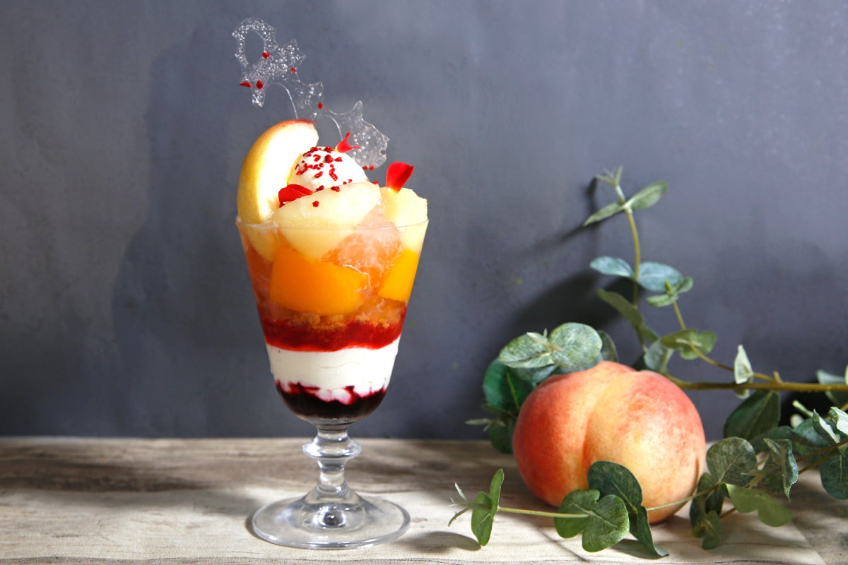 桃と相性のいいマスカルポーネとバニラのクリーム、バニラアイスクリーム、ジュレ・ベリーソースと合わせ、桃の美味しさを引きだし、9つの層にデコレーションし仕上げました。