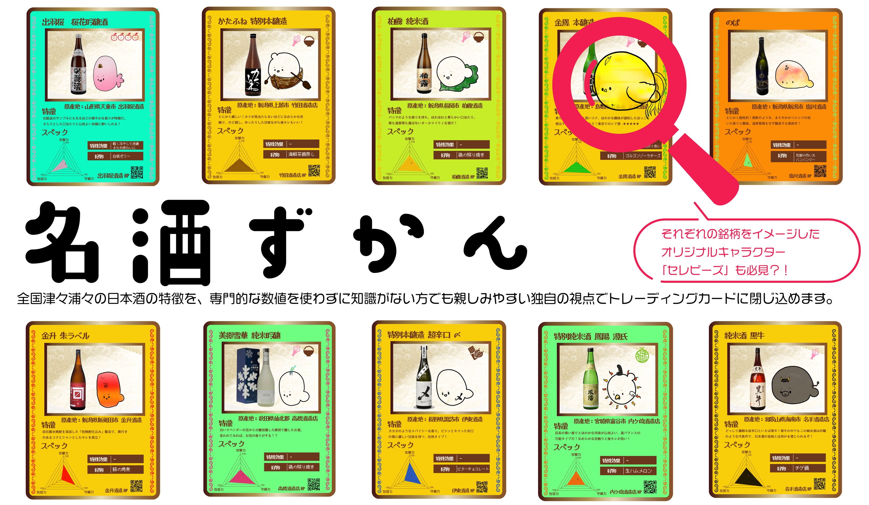 全国津々浦々の日本酒の特徴を専門的な数値を使わずに、知識がない方でも親しみやすい独自の視点でトレーディングカードに閉じ込めます。