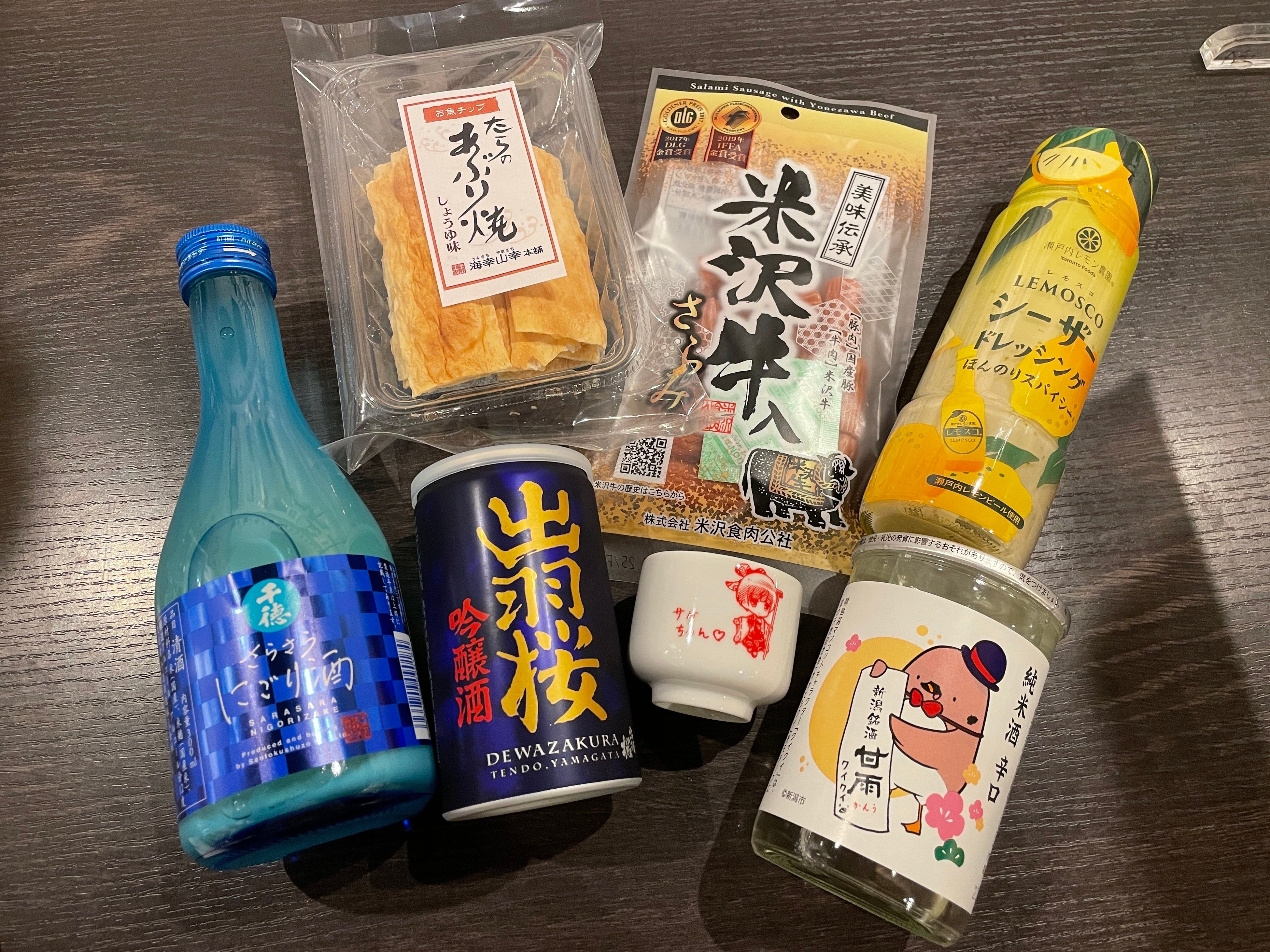 日本酒(300mlやカップ酒)、おつまみや調味料、オリジナルおちょこの詰め合わせ(写真は一例です)・・・20名様