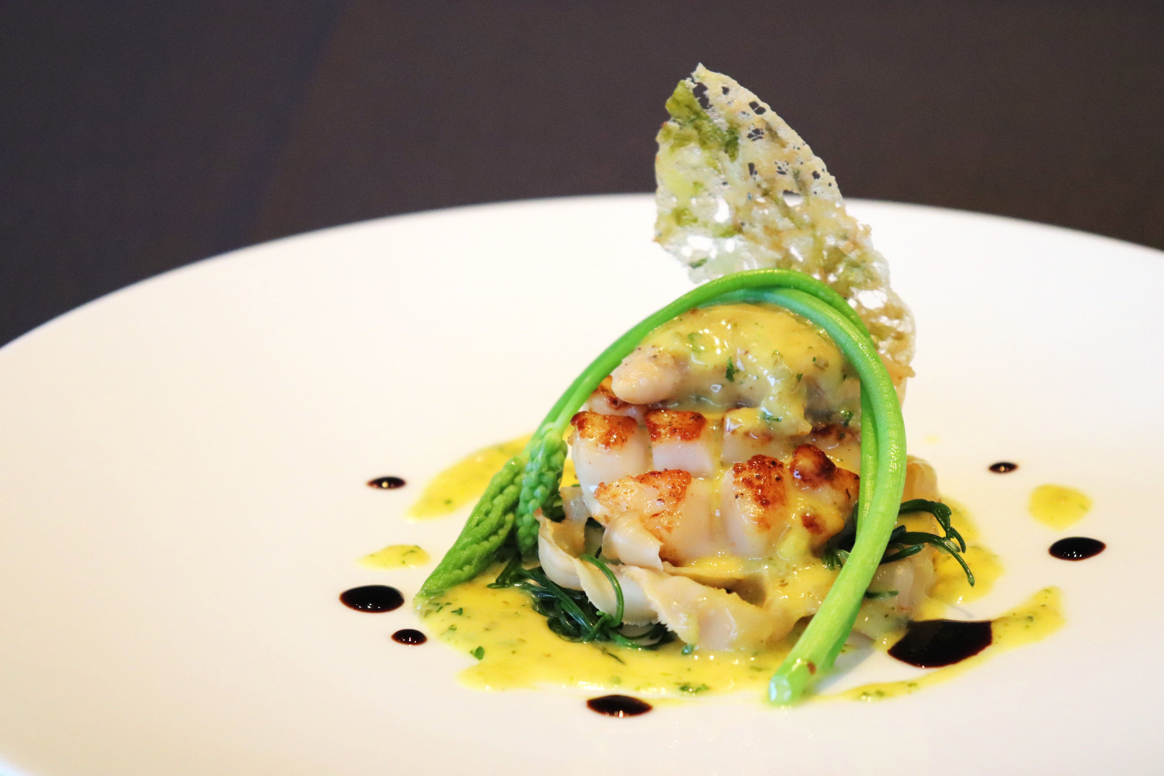 Dining & Bar TENQOOでは、“活帆立貝柱のポワレ サフラン香るヴァンブランソース”を提供いたします。“ひも”を煮詰めサフランで香りを加えたヴァンブランソースに、絶妙な火入れ加減でとろりとした食感に仕上げた貝柱と、“きも”のムニエルとの相性は抜群。一口で食べたくなる程の濃厚な旨味をお楽しみいただけます。和のエッセンスとして、優しい磯の香りがする生のりとしらすのガレットをアクセントに付け合わせました。