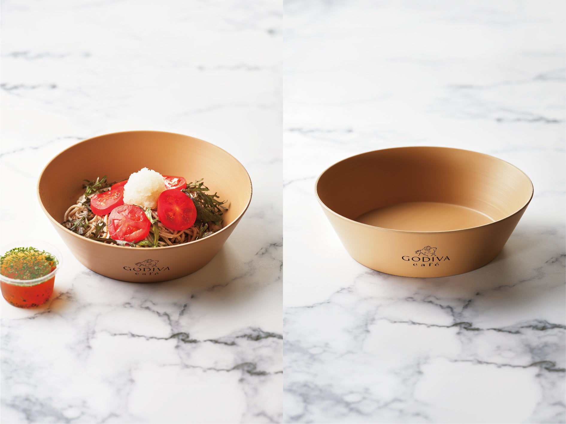 サラダ蕎麦用に今回新たに用意したのは、福井県の伝統工芸品である漆器で作られた器です。こちらは漆器ブランド「漆琳堂(しつりんどう)」のもので、ゴディバのロゴを印字して数量限定で準備いたしました。漆琳堂は過去、ゴディバカフェのメンバーが福井県を訪れた際に出会い、今回のメニュー発売に合わせてオーダーしたものです。
