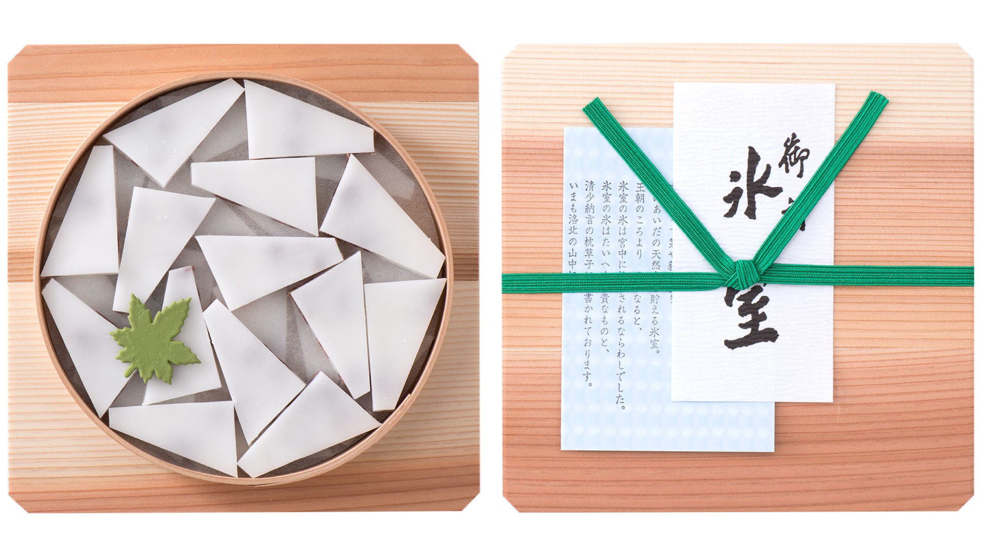 氷を張った木の桶をあらわした、木の香ふわりと漂う専用の木箱。このような三角形の意匠は「氷形(こおりがた)」と呼ばれる伝統の意匠で、生菓子「水無月」なども同じく氷を表現したものです。