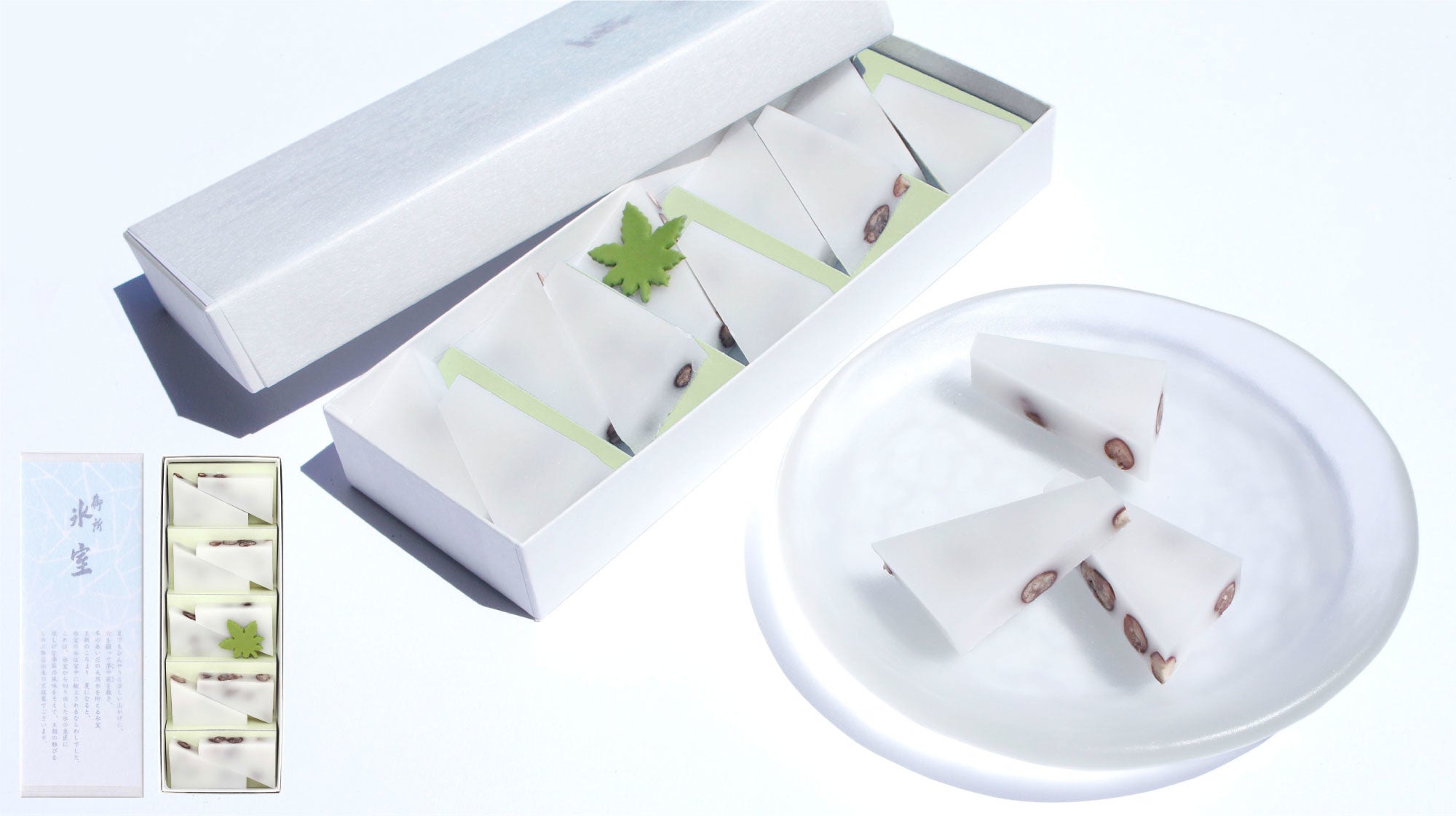 氷を張った木の桶をあらわした、木の香ふわりと漂う専用の木箱。このような三角形の意匠は「氷形(こおりがた)」と呼ばれる伝統の意匠で、生菓子「水無月」なども同じく氷を表現したものです。