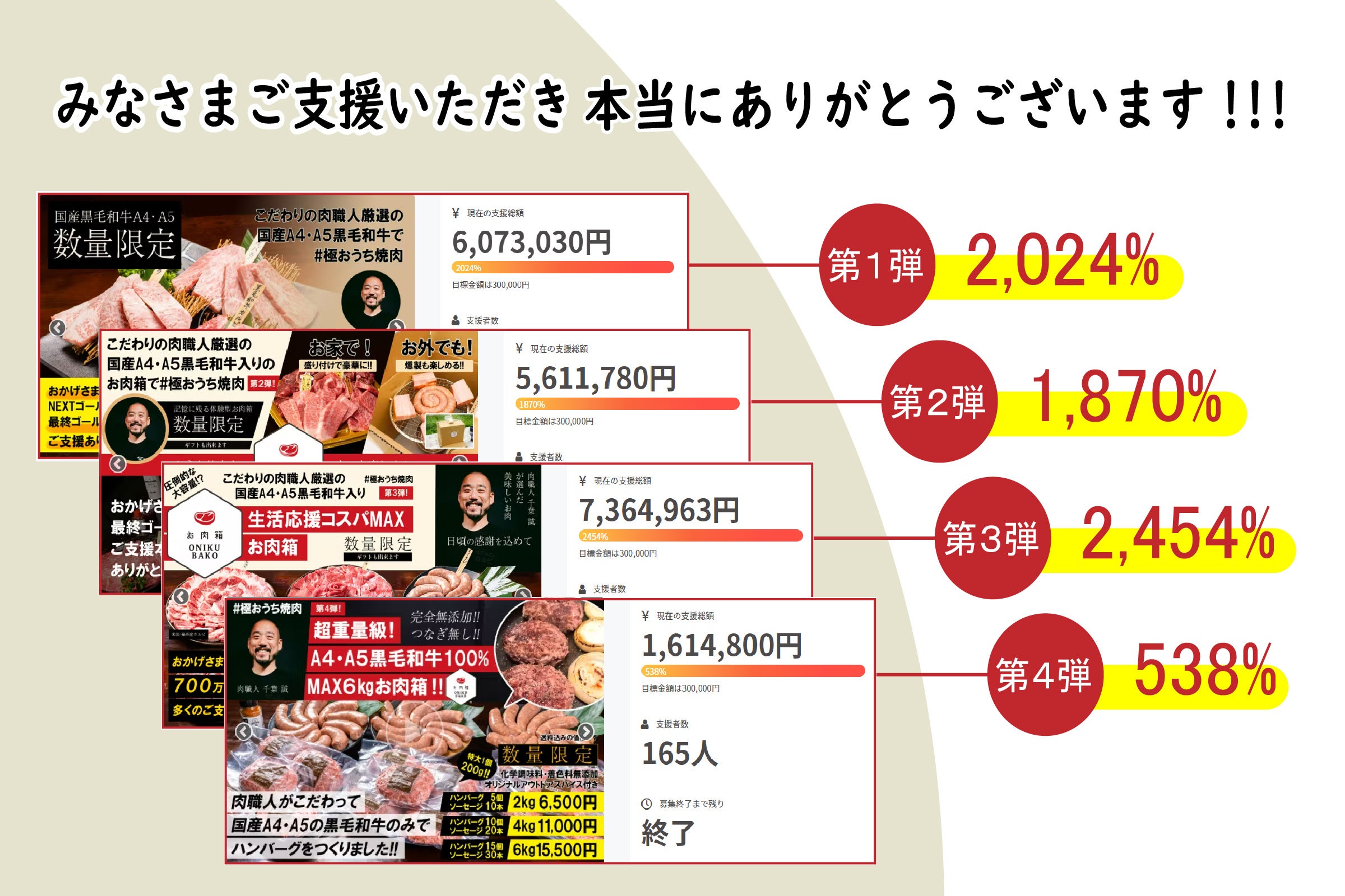 これまで4回に渡ってCAMPFIRE(クラウドファンディング)に挑戦させていただきました。 肉職人としてこだわりの国産和牛の魅力を発信し続けてきた結果、ありがたいことに多数のお客様からご支援をいただきました。