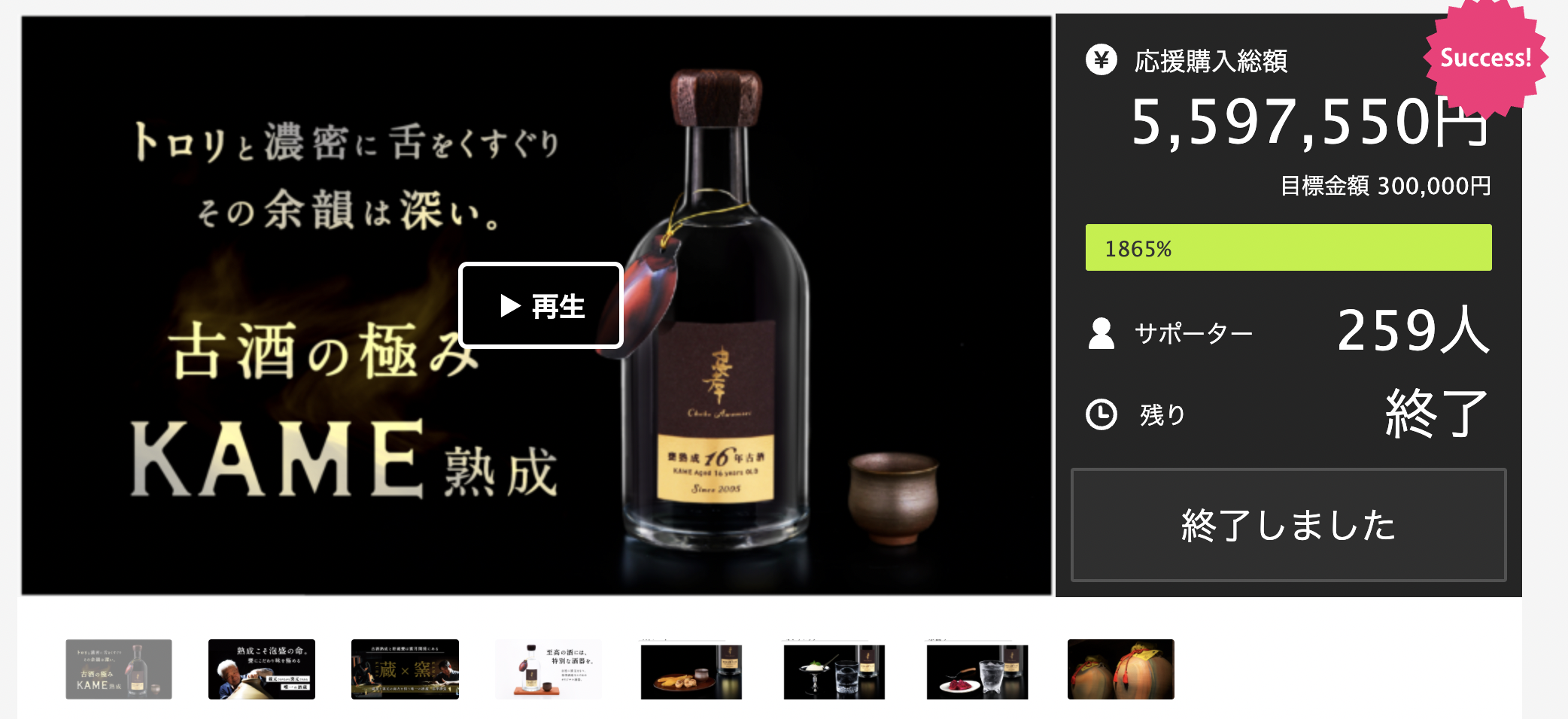 目標額300,000円に対し、1865%となる総額5,597,550円を達成。総勢259名のサポーターの皆さまにご支援いただきました。