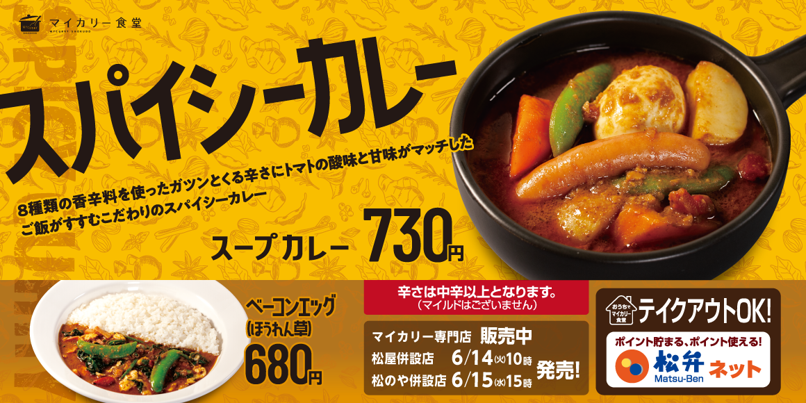 | 商品名 スパイシースープカレー 730円 スパイシーベーコンエッグ(キャベツ) 680円 スパイシーベーコンエッグ(ほうれん草) 680円 ※お持ち帰りいただけます。 ※全て税込み価格です。また、店内・お持ち帰りの税込価格は同一です。 ※「スパイシーベーコンエッグ(キャベツ)」は「マイカリー食堂併設店」での販売はいたしません。 ※辛さは「中辛」以上となります。マイルドのお取扱はございません。 発売日 【松屋併設店】6月14日(火)10時 |