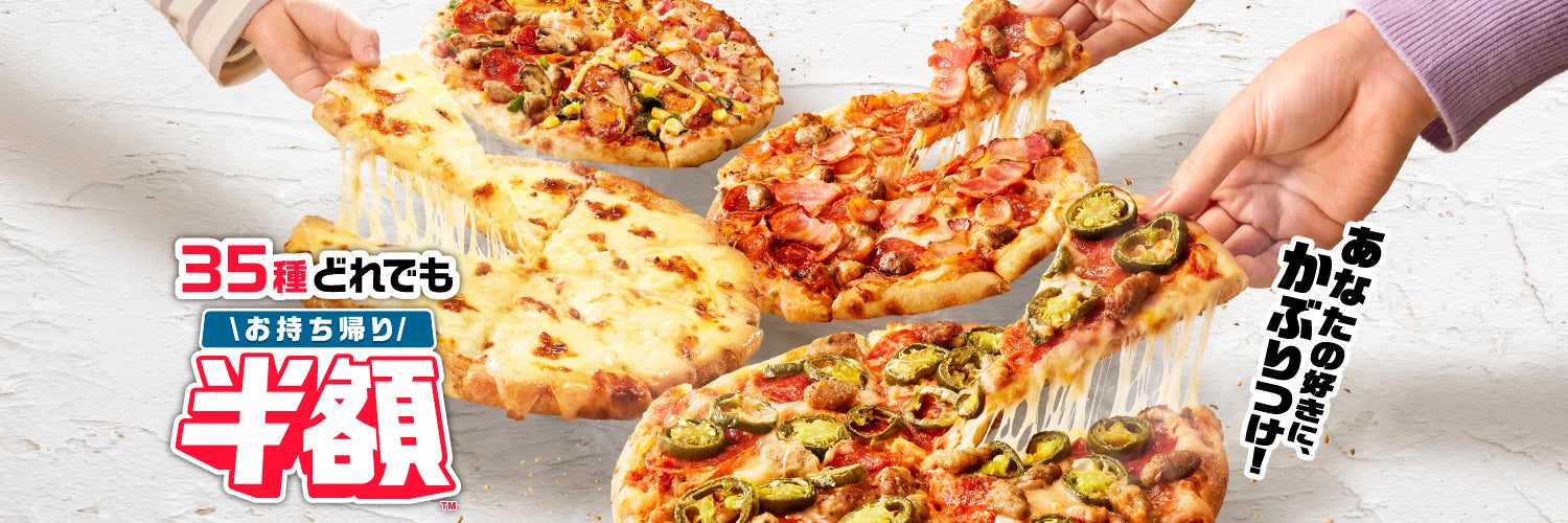 ドミノ・ピザでは、1枚から何枚でも、どのピザでも半額になる「お持ち帰り半額™」を実施しております。ぜひこの機会に、「推しピザ発掘診断」で出会った推しピザをお持ち帰りし、お得にお楽しみください。