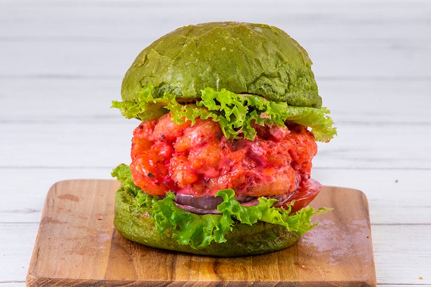 ビーフパティの替わりにシラチャーマヨネーズで和えた小エビをたっぷりと入れたエビバーガー。