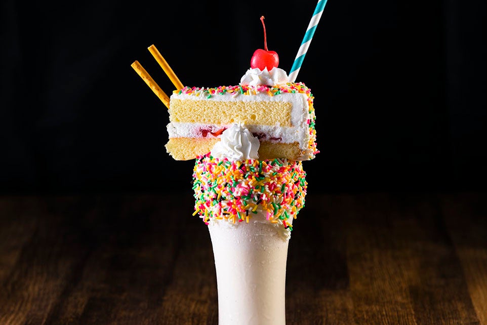 ニューヨーク発祥。バニラシェイクの上にケーキをトッピングした、今にもこぼれ落ちそうなダイナミックなシェイク。