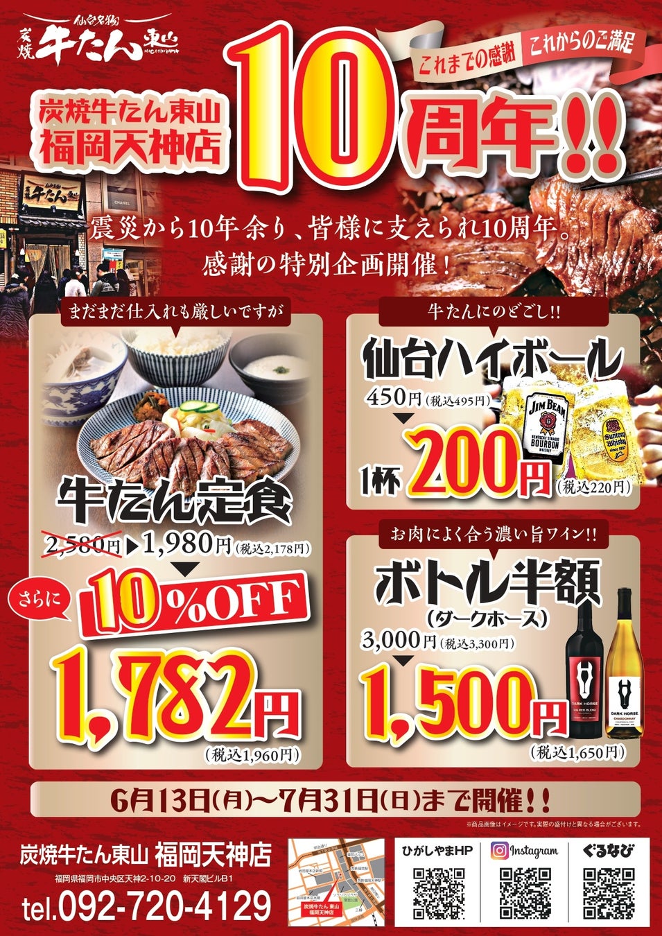 仙台名物牛たん専門店「炭焼牛たん東山」、焼肉専門店等飲食業態を展開してる、株式会社ひがしやま(本社:宮城県仙台市、代表取締役 中山栄一) は、2022年6月13日より、炭焼牛たん東山 福岡天神店10周年特別企画を開催。東日本大震災から10年余り、地域の皆様に支えられ、福岡の地で10周年を迎える事ができた事に感謝し、「これまでの感謝、これからのご満足・10周年特別企画」を開催します。
