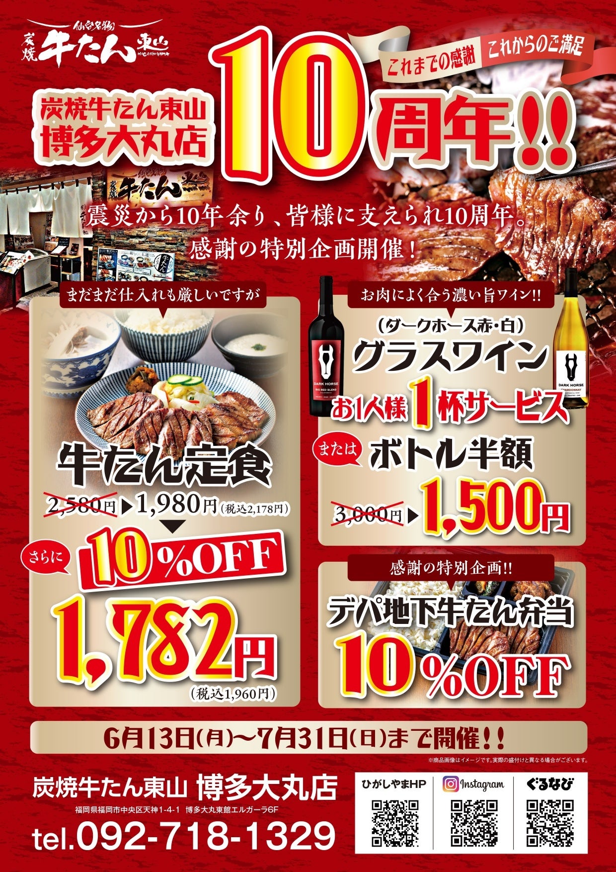仙台名物牛たん専門店「炭焼牛たん東山」、焼肉専門店等飲食業態を展開してる、株式会社ひがしやま(本社:宮城県仙台市、代表取締役 中山栄一) は、2022年6月13日より、炭焼牛たん東山 福岡天神店10周年特別企画を開催。東日本大震災から10年余り、地域の皆様に支えられ、福岡の地で10周年を迎える事ができた事に感謝し、「これまでの感謝、これからのご満足・10周年特別企画」を開催します。