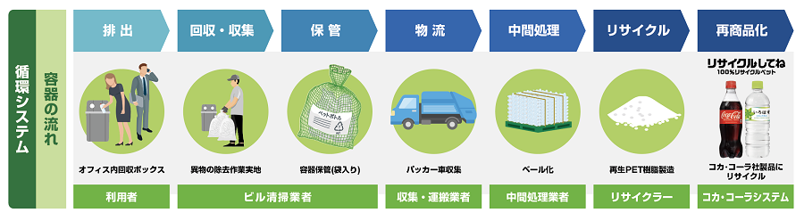 対象ビル執務内に設置した回収ボックスで集められた使用済みPETボトルは、粉砕・洗浄などの中間処理を経て、再原料化されます。再生されたPET原料は、当社各工場にてコカ・コーラ社製品の容器に使われます。