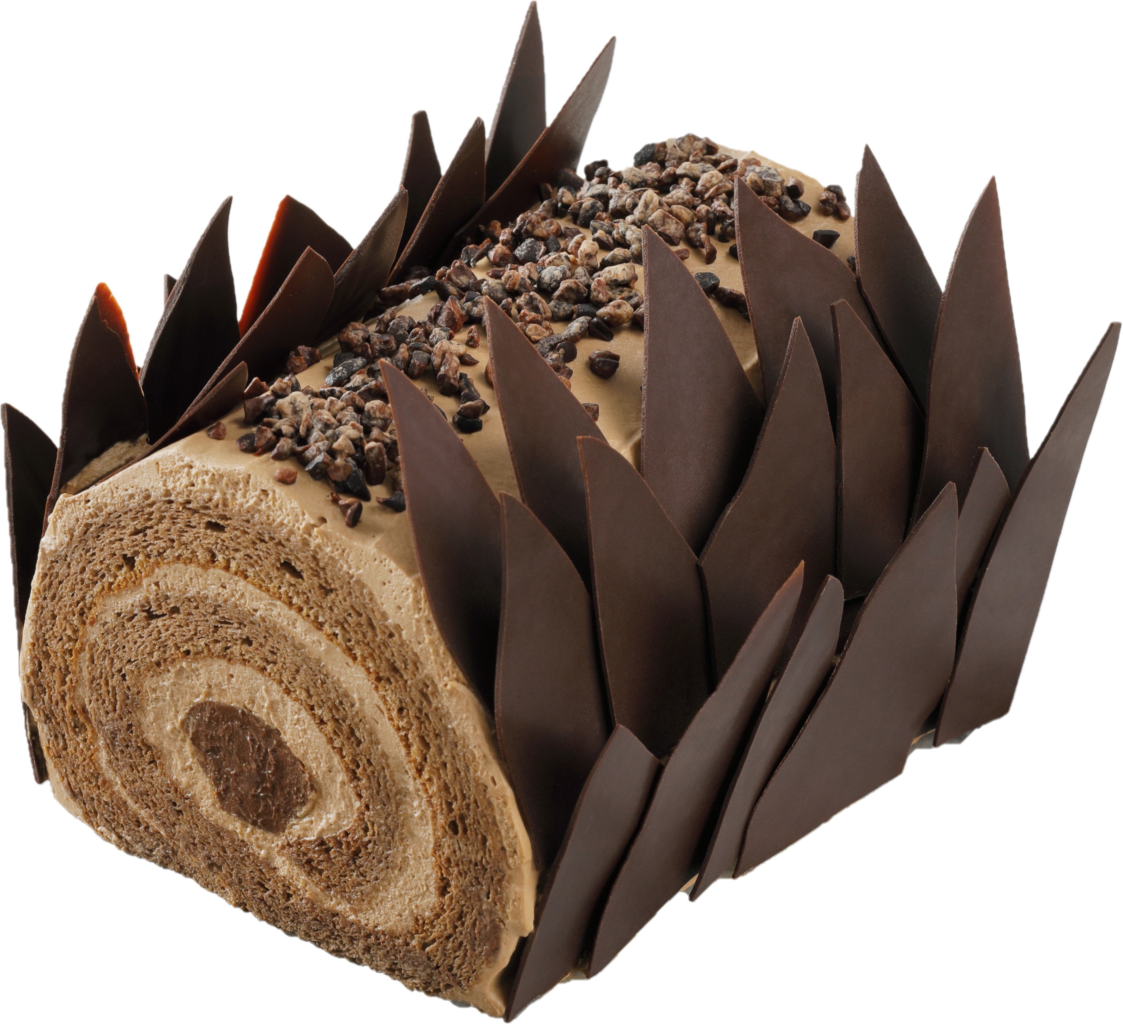 そして、立体的に貼り付けた板チョコレートにもホールフルーツカカオを使用し、糖衣がけしたカカオニブを最後に飾って食感のアクセントにしています。まさにカカオをまるごと味わうロールケーキです。