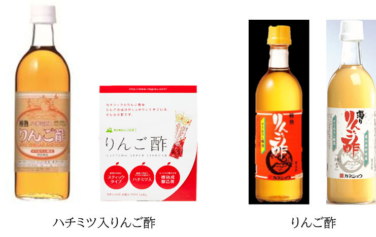 カネショウの独自製法はカネショウの良質なりんご酢は完熟りんご100%で、他のりんご酢より、なんと言っても「原料」が違います。多くのりんご酢は外国からの輸入りんご果汁を原料にしていますが、カネショウのりんご酢の原料は、りんごのふるさと津軽の完熟りんご100%です。丸ごとりんごをすりおろして発酵させる、全国でもとても珍しい醸造法。まろやかな優しいりんご本来のさわやかな風味が特徴です。
