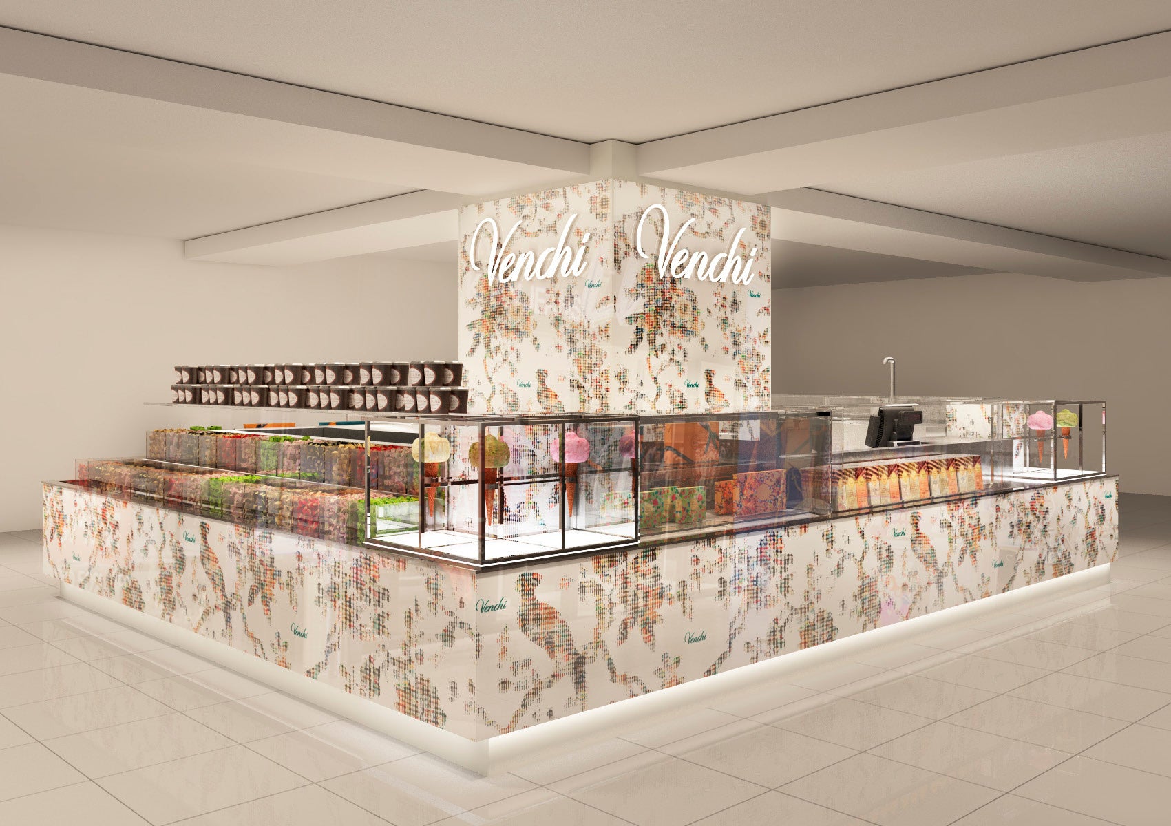 店舗はVenchi各店を象徴する花鳥柄でデコレートされ、華やかで高級感のある明るい空間となります。