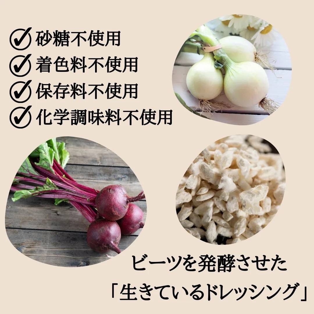 野菜を発酵させた手作りドレッシングです。 今までのドレッシングの常識を覆すコク深さとマイルドな味わいは発酵のおかげ。 お砂糖は一切使用せず、発酵させたお米とお野菜の自然な甘さだけ。カラフルな色合いもお野菜本来の色合いです。