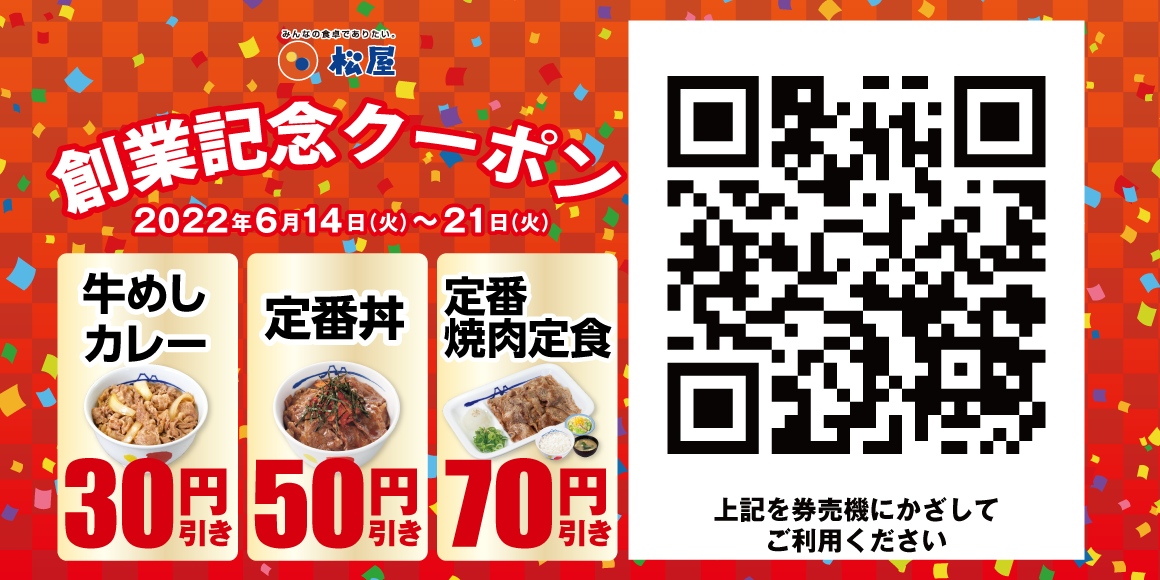 1966年6月16日に「たった一度しかない人生、商売に挑戦してみたい」という創業者の志から『中華飯店「松屋」』を開店したことから松屋の歴史が始まり、創業以来、新しい美味しさを追求し続けることをモットーに、つねに新たな一歩を踏み出し続けています。みなさんの毎日を元気づけたくて生まれてきた品々を、このたび創業56周年を記念し、松屋公式アプリやLINE、Twitter等を通し「創業記念クーポン」という形でお得にお届けします。牛めし・カレーは30円引き、定番丼は50円引き、定番焼肉定食は70円引きでお楽しみいただけます。キャンペーン期間中は何度でもクーポンをお使いいただけますので、ぜひこの機会に創業56周年を迎えた「松屋」をご利用くださいませ。