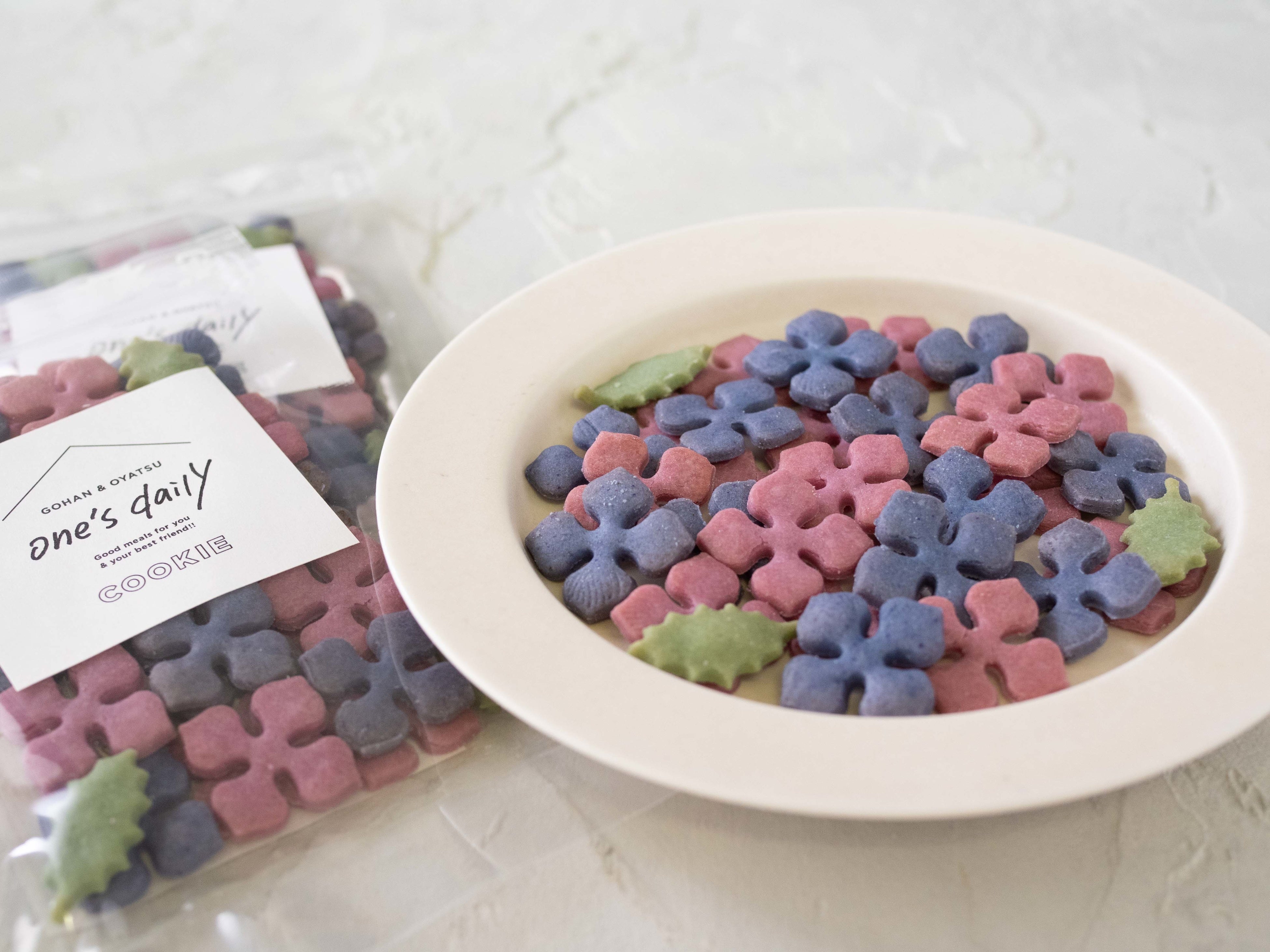 青色の花びらにはバタフライピー、赤紫色の花びらには紫いも、緑色の葉っぱにはスピルリナを使用。鮮やかなのにからだにやさしいクッキーに仕上がっています。