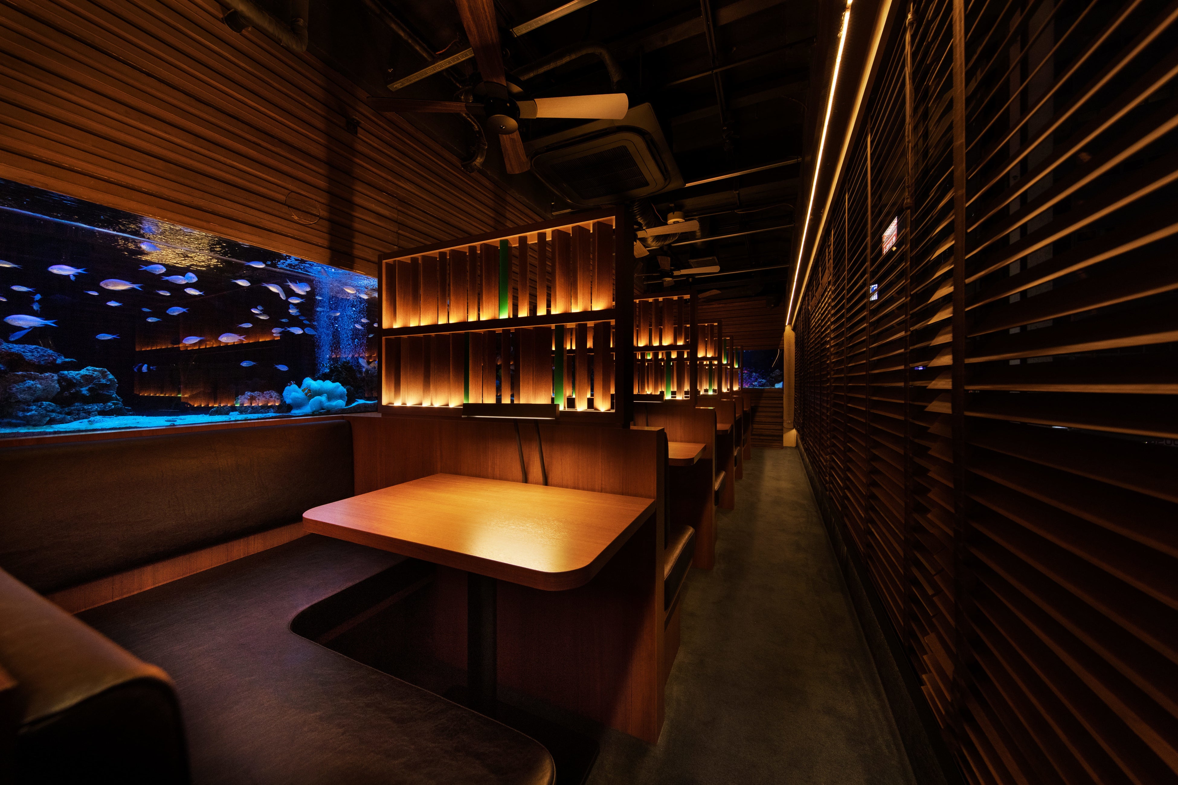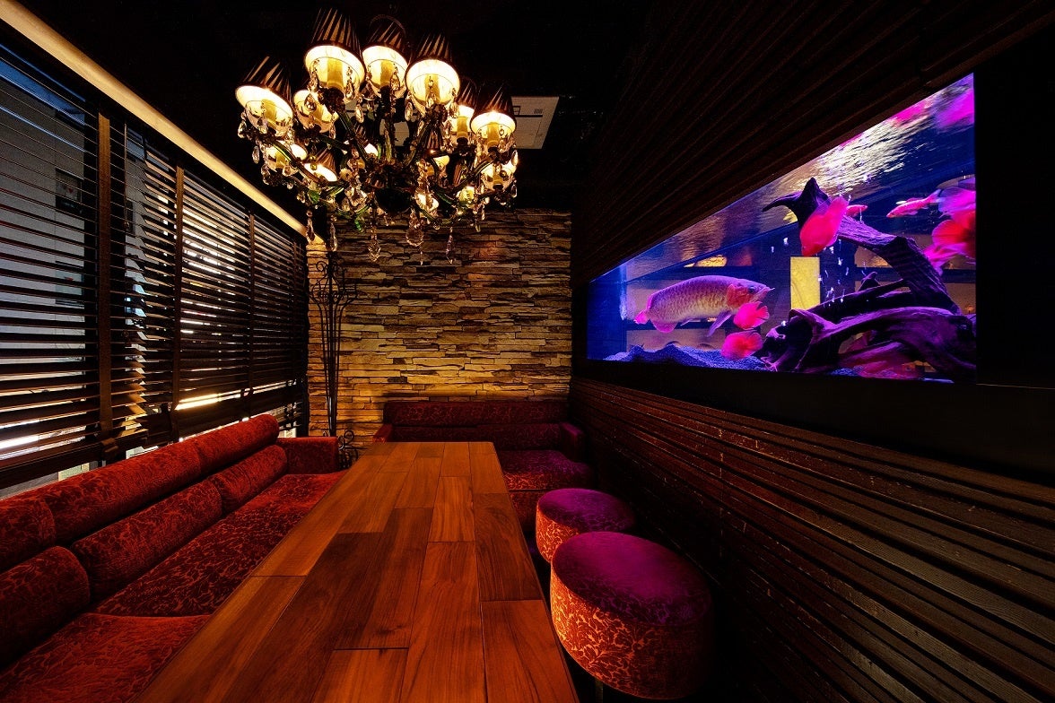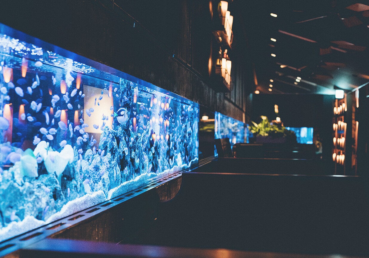 照明を落とした店内は幻想的な雰囲気。会話がはずむ、4名様からはゆったりソファ席やVIP個室などございます。全席から観えるアクアリウムをお楽しみいただけます。