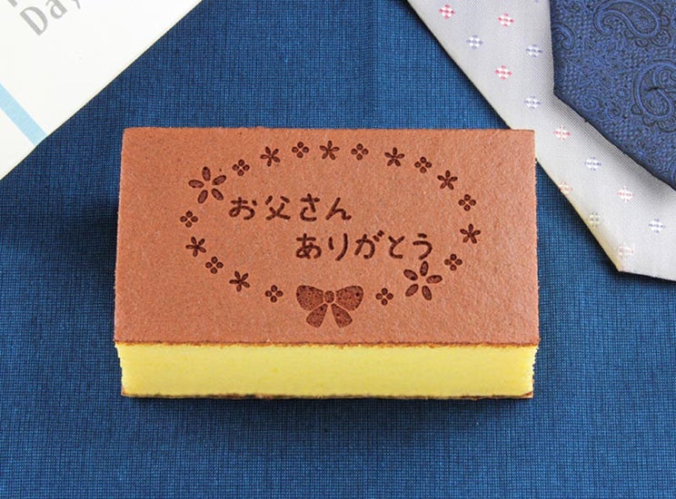 「お父さん ありがとう」の感謝の気持ちを焼印した、父の日の絵柄とメッセージを描いた、特別なカステラです!