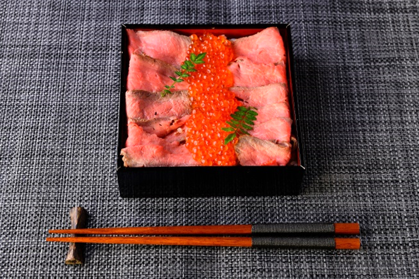 柚子酢飯にローストビーフといくらをのせました。目にもお腹にも嬉しい贅沢な肉ちらしです。お父さんの嬉しそうな顔が目に浮かびます!