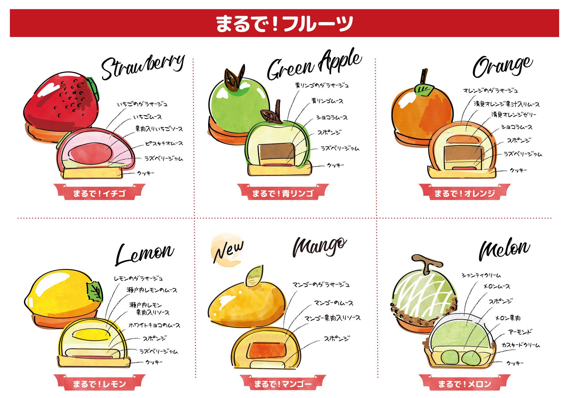 本物のフルーツそっくりのコロンとしたケーキ“まるでフルーツ”は、イタリアンレストラン「マンマパスタ」やイベント販売でも大人気!見た目の可愛さはもちろん、頬張るとお口いっぱいに広がる果汁たっぷりのムースとサクッとした焼き菓子の食感がたまりません。小ぶりのサイズだけにいくつでも食べられそうな爽やかな美味しさで、ご自宅へのテイクアウトのほかにもお土産やちょっとしたプレゼントにぴったりです。