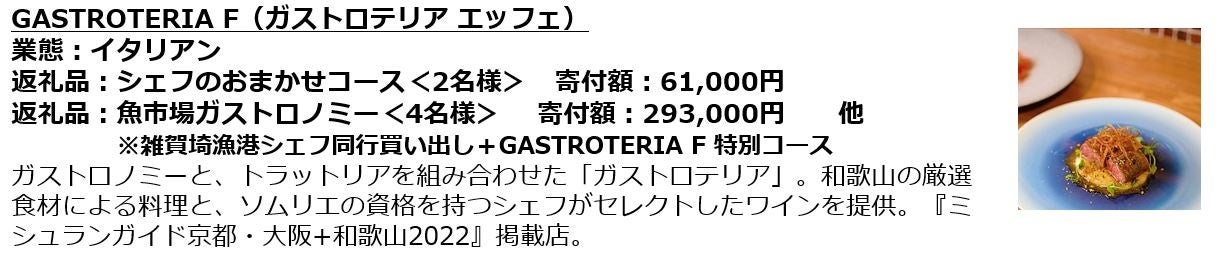 本取り組みには、和歌山市の『ミシュランガイド京都・大阪+和歌山 2022』に掲載されている飲食店や地元の人気店が参画し、主に大阪・京都・兵庫など近隣エリアから、休日を利用して訪れるお客様などに向け、返礼品として和歌山市の産品を活用した料理を中心に提供します。また、シェフと一緒に漁港で食材仕入れを体験した後に味わうことができる「ガストロノミー体験型のコース料理」など独自の返礼品も展開します。