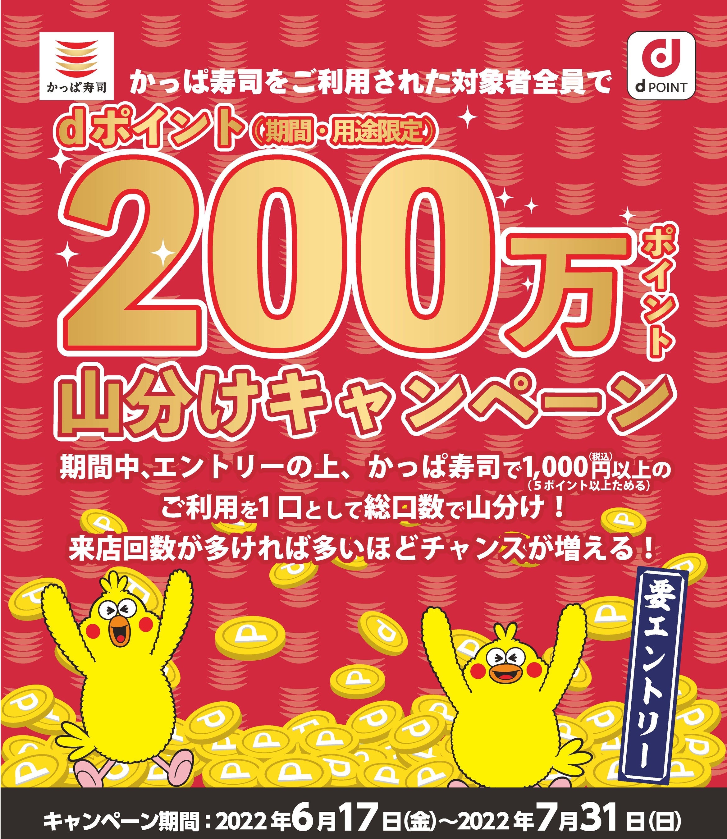 コロワイドグループのかっぱ寿司(カッパ・クリエイト㈱ 本社:神奈川県横浜市)は、2022年6月17日(金)~7月31日(日)の期間、株式会社NTTドコモと提携した「かっぱ寿司 dポイント200万ポイント山分けキャンペーン」を、かっぱ寿司全店にて実施いたします。
