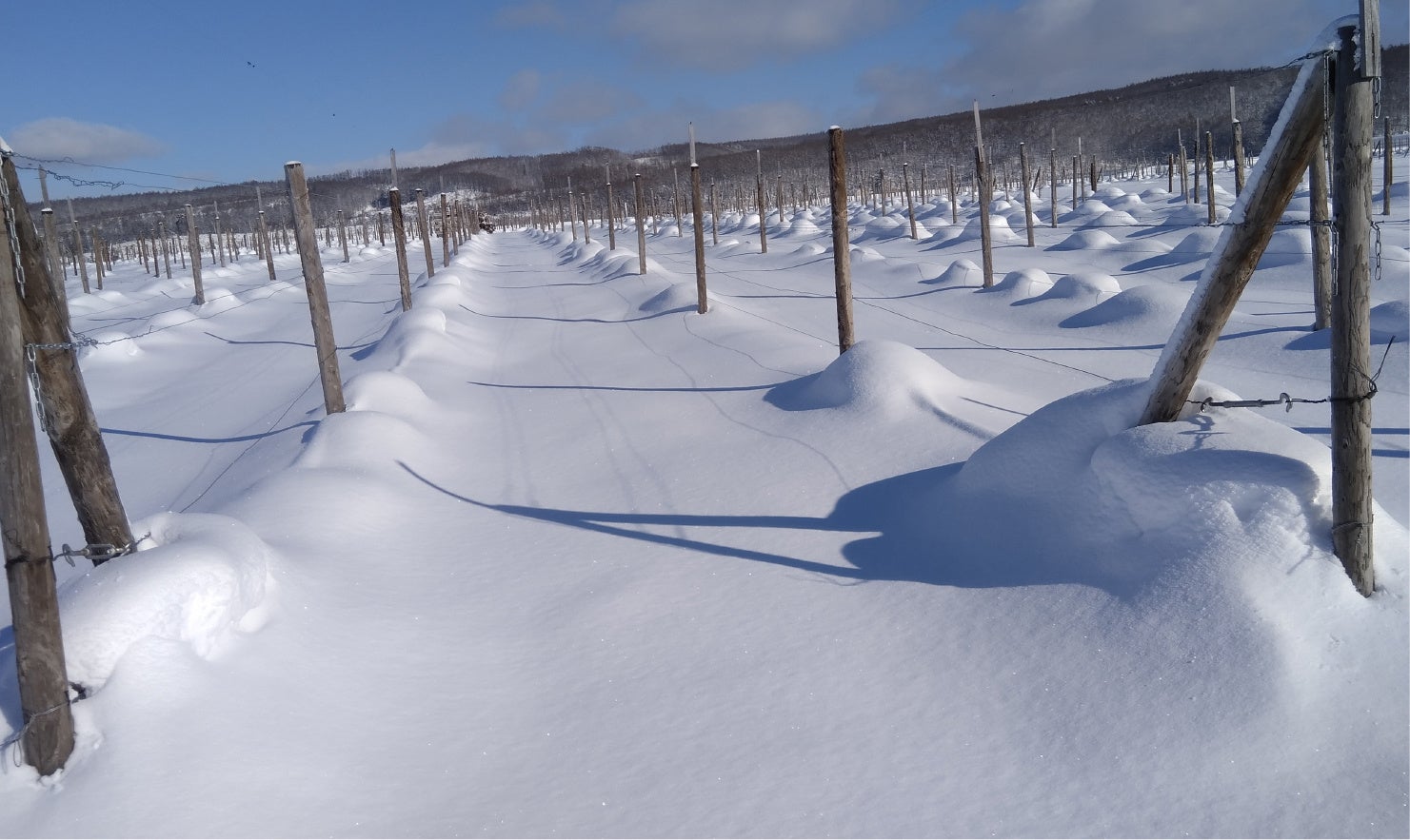 雪かけ後、雪解けの春まで雪の中でゆっくり休むブドウの木