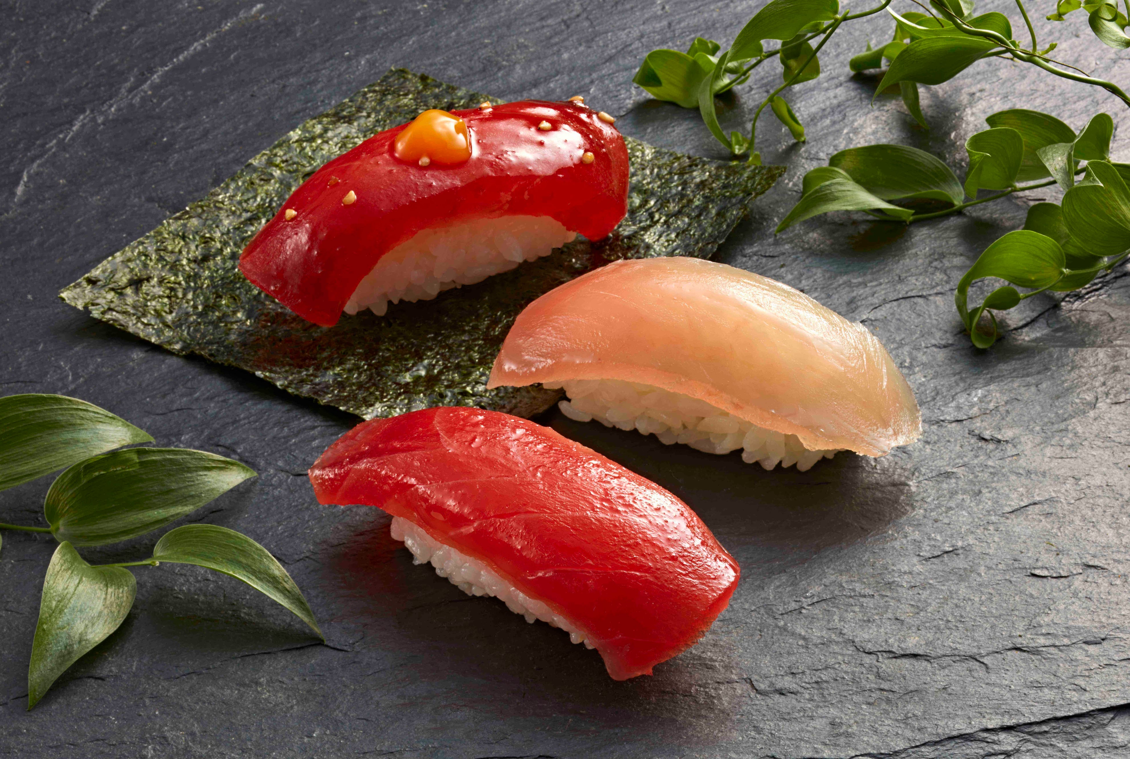 「まぐろ三種盛り」天然の赤身まぐろと天然のビンチョウまぐろを贅沢に使い、3 種盛りにしました。甘辛いユッケタレと卵黄のコクが加わったまぐろユッケ握りは何度も食べたくなるやみつきになる一品です。