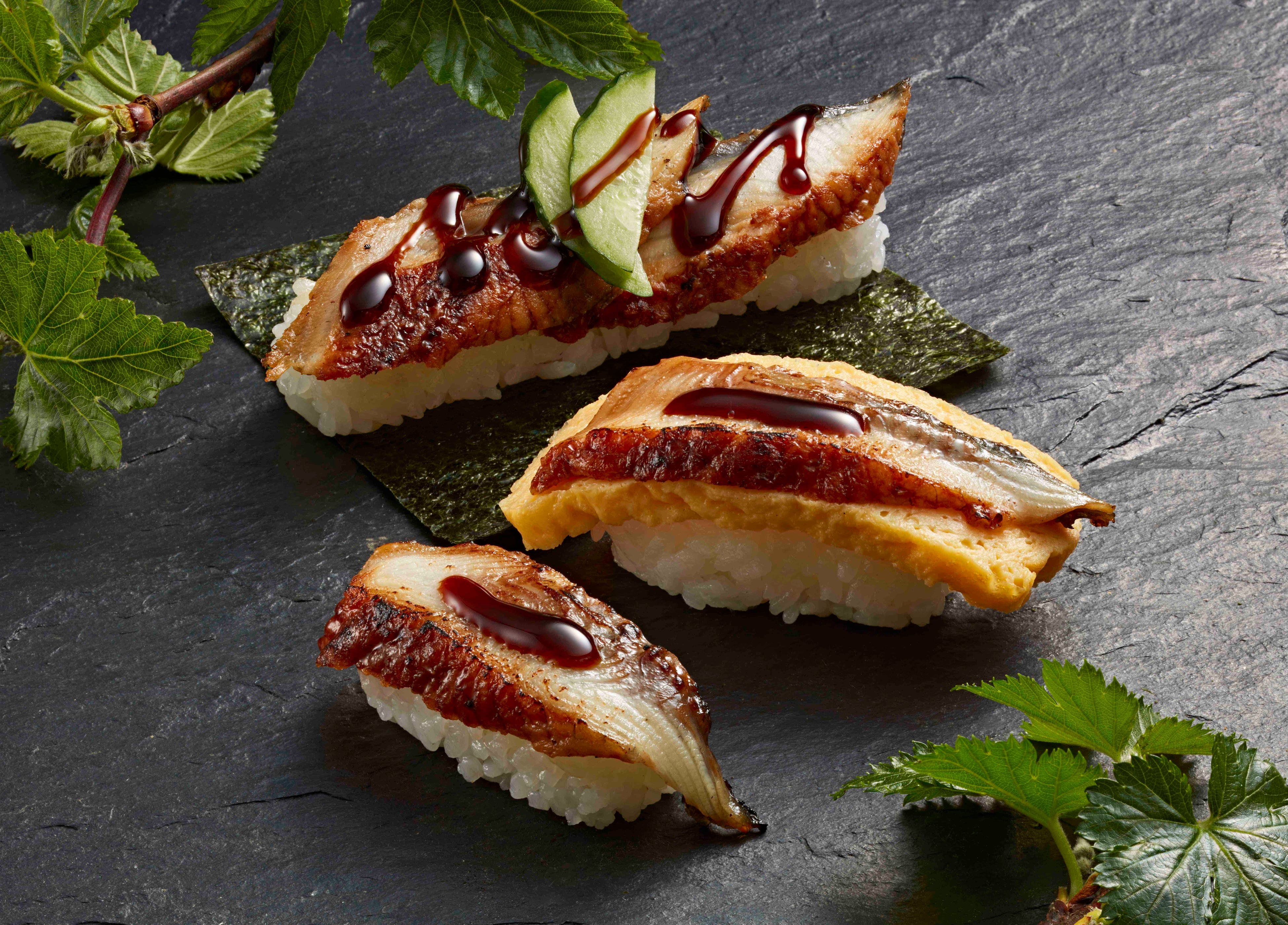 「炙り鰻握り」厳選したエサで丁寧に育てられた鰻を、こだわりのタレで三度にわたりじっくり香ばしく焼き上げ、握り寿司にしました。