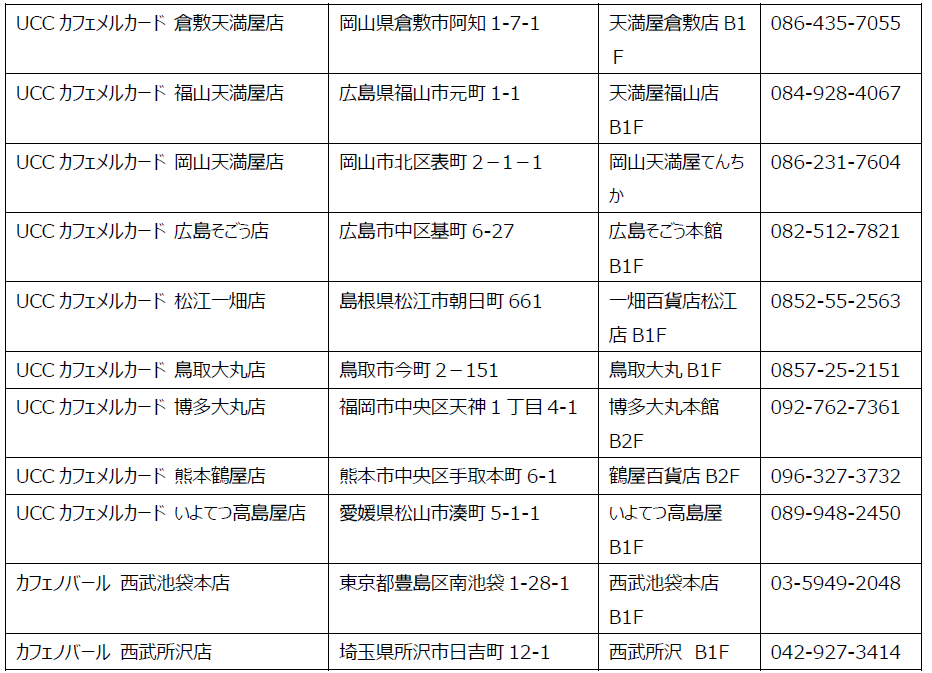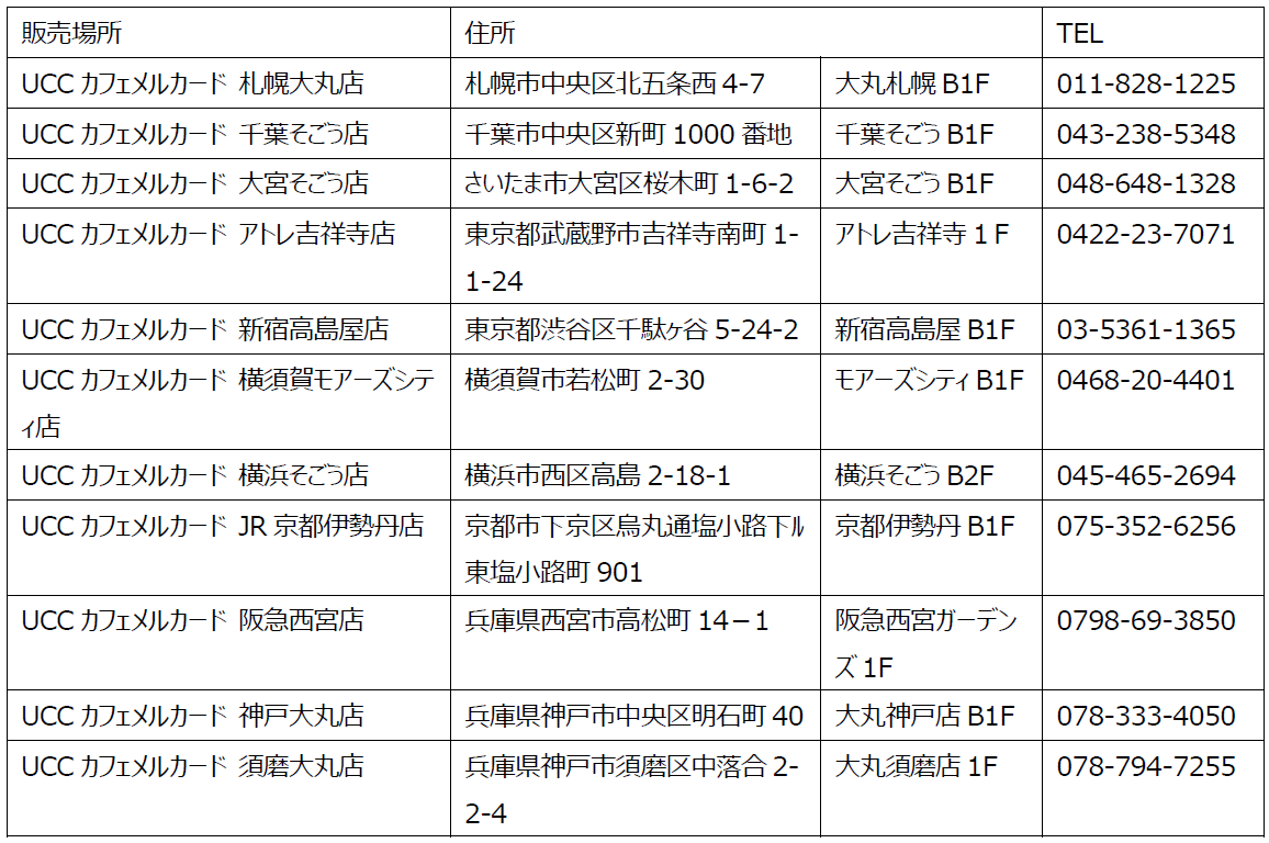 取り扱い店舗一覧(コーヒー豆の挽き売り業態『UCCカフェメルカード』20店舗、『カフェノバール』2店舗 計22店舗)
