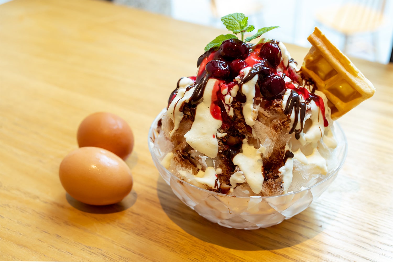アニマルウェルフェア(動物福祉)の観点から、平飼い卵を使用したカスタードソースのかき氷です。トッピングにはいちごとラズベリーのミックスベリーソースとチョコレートソース、クランベリーとカシスの実を使用。国産小麦粉と平飼い卵で作ったワッフルを添え、パフェ風に仕上げています。