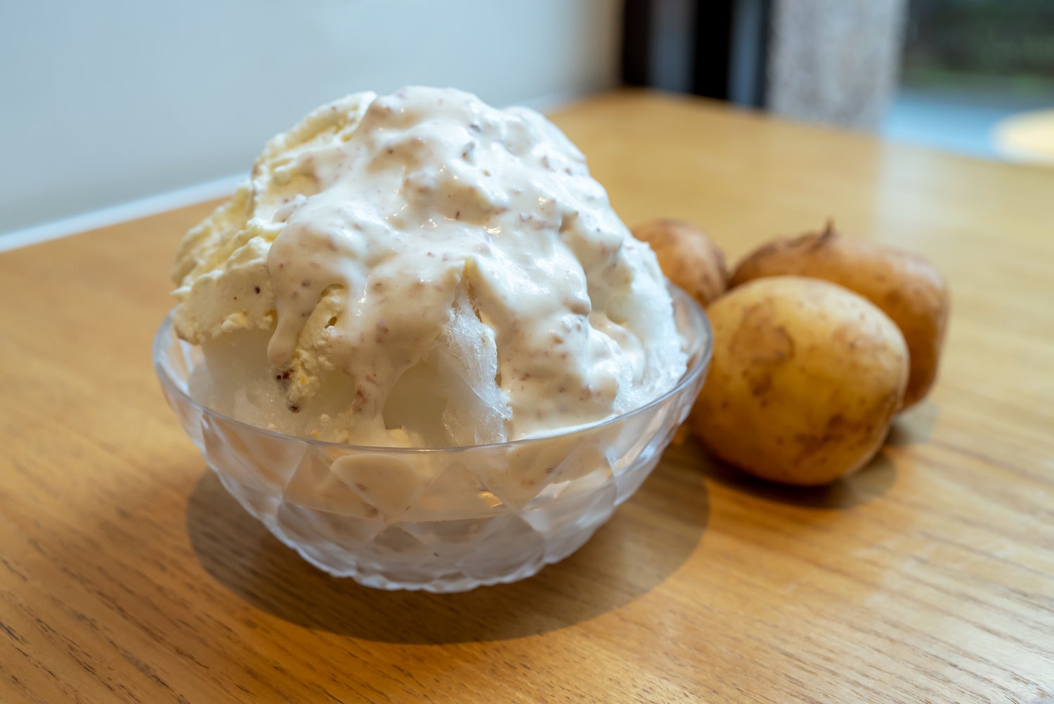 かき氷=甘いお菓子の概念を覆す、ベーコンポテトのかき氷です。福岡産の糸島豚ベーコンを使用し、千葉県産有機栽培のじゃがいもをベースにしたソースと、北海道産クリームチーズをベースにした2種類のソースで仕上げています。生クリーム、塩、胡椒、マスタード、オリーブオイルで味付けをしており、ヴィシソワーズのような冷製スープとしてもお楽しみいただけます。