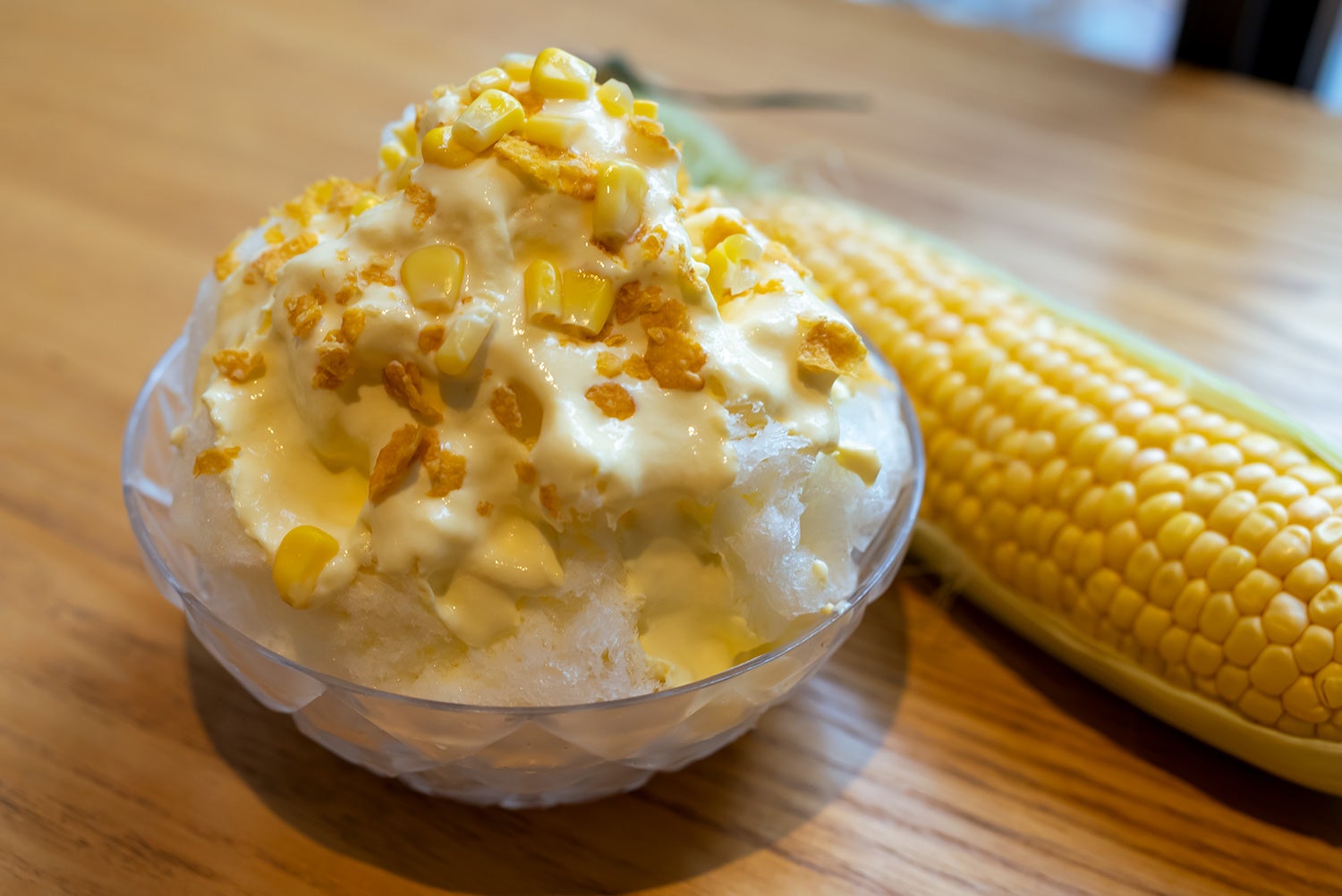 旬のとうもろこしを使用した、やさしい甘さが特徴のかき氷です。とうもろこしペーストと生クリームを使用したクリームソースに、コーンフレークととうもろこしの蜜煮をトッピングしています。半分はそのまま、半分は氷を少し溶かして冷製スープのようにお楽しみいただくのもおすすめです。