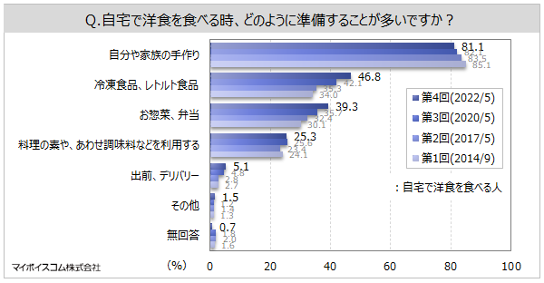 自宅で洋食を食べる人の準備方法は(複数回答)、「自分や家族の手作り」が81.1%、「冷凍食品、レトルト食品」が46.8%、「お惣菜、弁当」が39.3%となっています。過去調査と比べて、「冷凍食品、レトルト食品」「お惣菜、弁当」が増加傾向です。