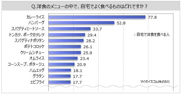 自宅でよく食べる洋食メニューは(複数回答)、「カレーライス」が77.8%で最も多く、次いで「ハンバーグ」が52.8%です。以下、「スパゲティミートソース」「トンカツ、ポークカツレツ」「スパゲティナポリタン」が3割前後で続きます。