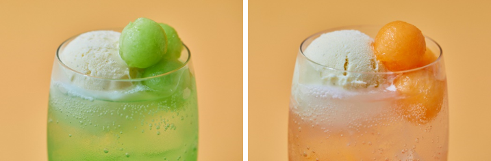 ほんのりレモンの酸味を効かせたメロン風味のクリームソーダにタカミメロンの果肉をトッピング。