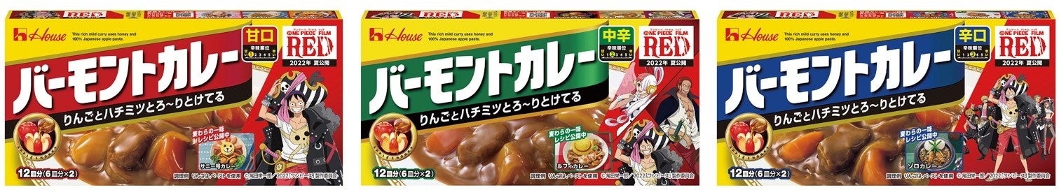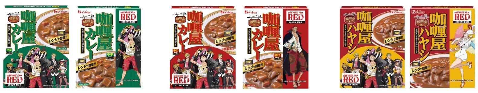 「こくまろカレー」「バーモントカレー」「完熟トマトのハヤシライスソース」「咖喱屋(カリー屋)シリーズ」「フルーチェ」の5ブランドで、『ONE PIECE FILM RED』とのタイアップパッケージ(全12種類)を発売し、店頭を盛り上げます。