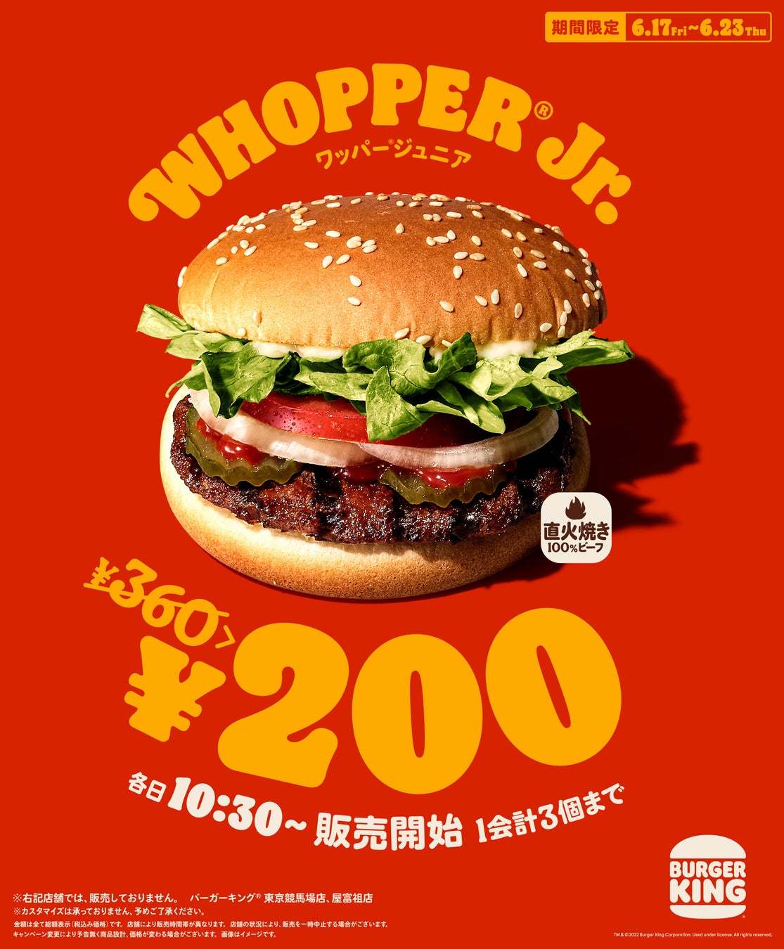 株式会社ビーケージャパンホールディングス(本社:東京都千代田区)は、2022年6月17日(金)~6月23日(木)の1週間限定で、各日10時30分から『ワッパー® ジュニア』を通常価格360円のところ、160円引きの200円で販売いたします。