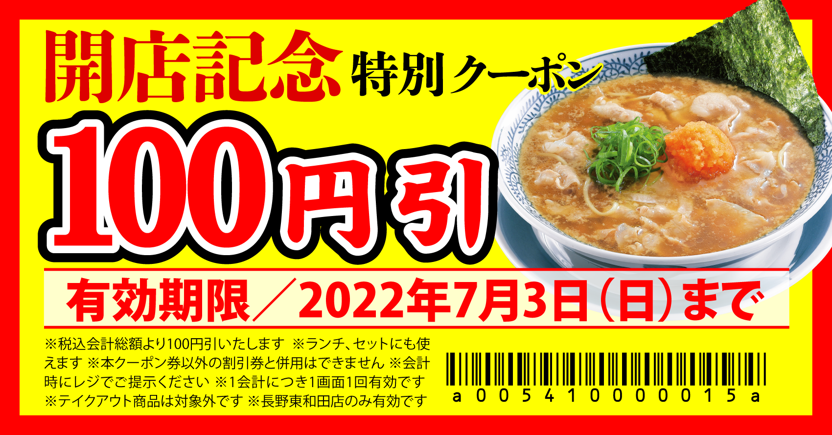 株式会社物語コーポレーション(本社:愛知県豊橋市/代表取締役社長:加藤 央之)が運営する『丸源ラーメン』は、2022年6月22日(水)に、全国182店舗目となる『丸源ラーメン 長野東和田店』(長野県長野市)をグランドオープンいたします。オープン記念として、2022年7⽉3⽇(日)まで『丸源ラーメン 長野東和田店』のみでご利⽤いただける100円引クーポンを配布します。