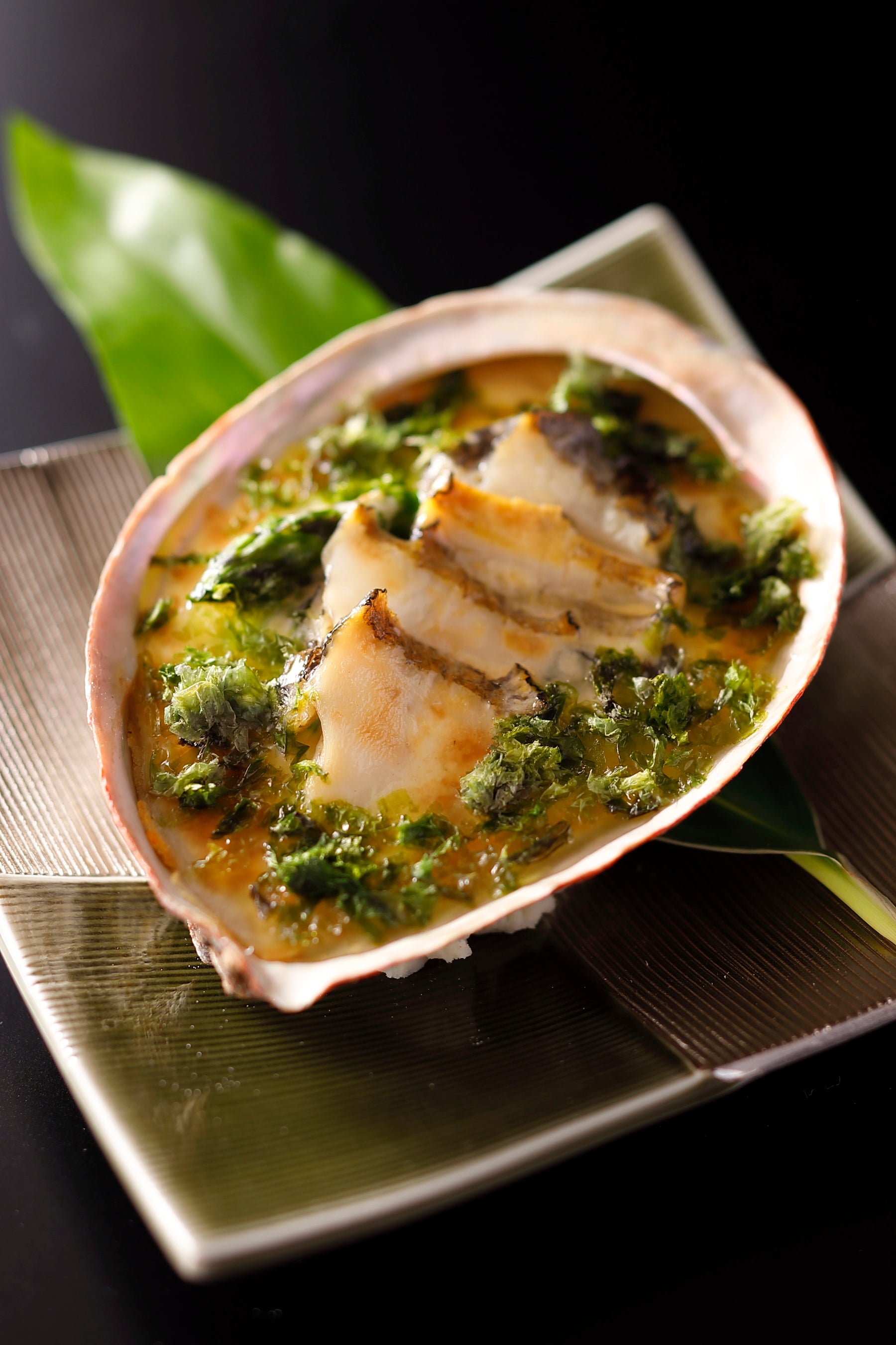 焼き物には宮田こだわりの『蒸し鮑香味焼』が登場。旨みたっぷりの新鮮な鮑をやわらかく蒸しあげ、香ばしい海苔とともに卵のソースに絡め一つ一つ丁寧に焼き上げます。鮑の旨みと磯の香りが絶妙にマッチする逸品です。