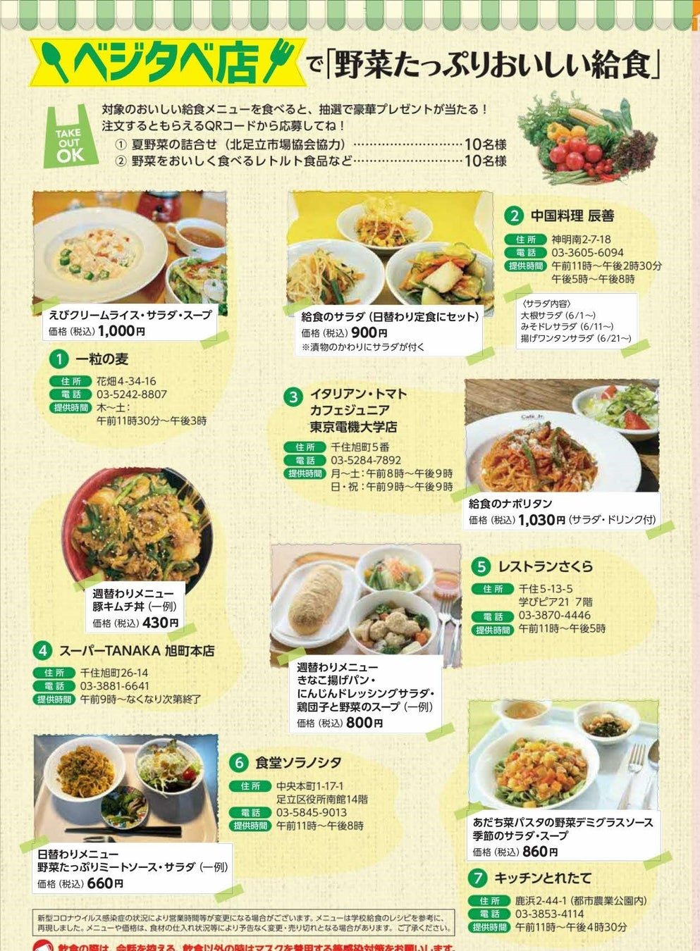 ベジタベライフ協力店で「野菜たっぷりおいしい給食」が楽しめる!今年の食育月間では、区内7店舗で野菜がたっぷり入った”足立区のおいしい給食”を再現したメニューが楽しめます。また、食べた方に抽選でプレゼントが当たる特別企画も実施中!特別企画で食育月間を盛り上げます。