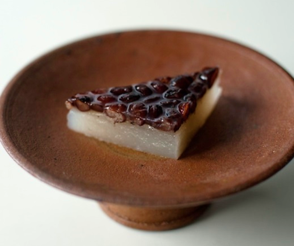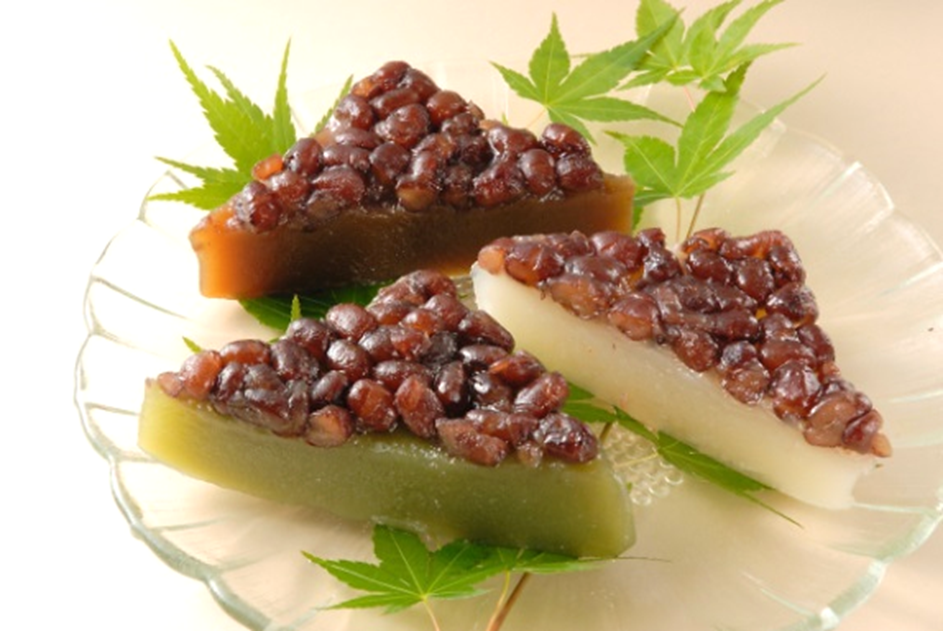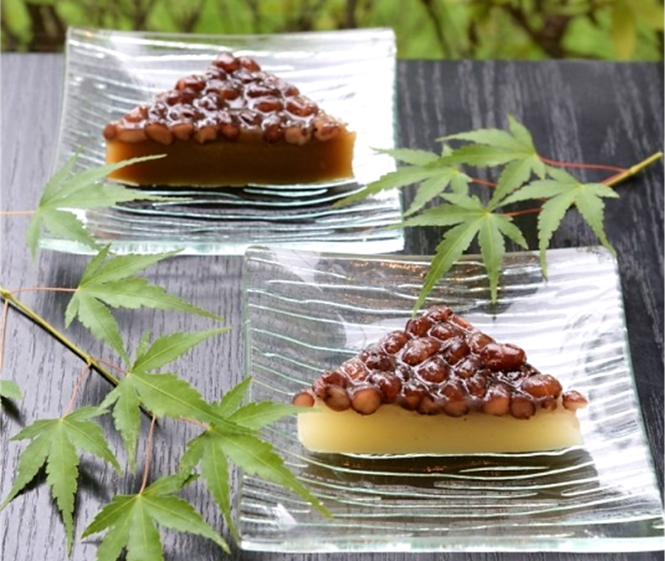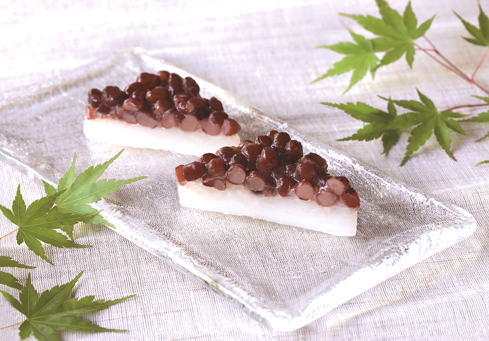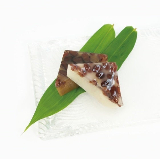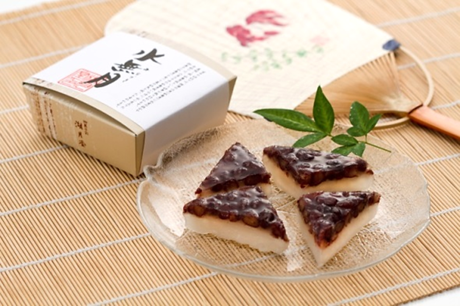 上部の小豆は魔除けを、三角形に包丁を入れるのは暑気を払う氷に見立て、盛夏を越す滋養を求めた伝統の夏菓子です。